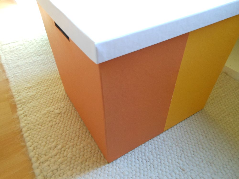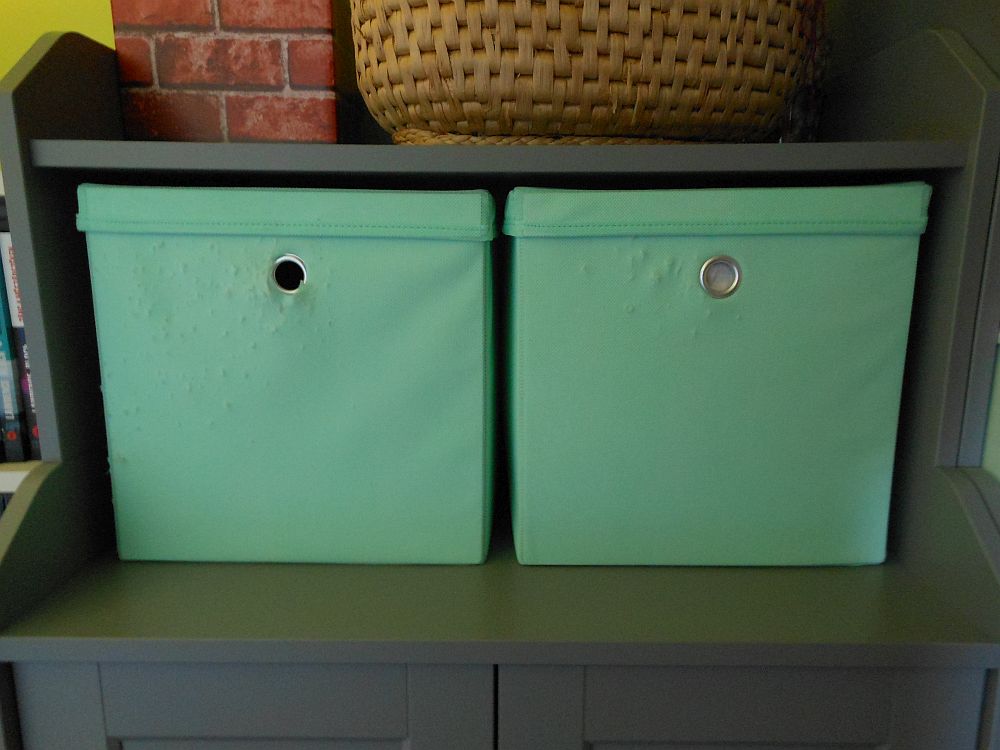A Kallax polcban található Tjena dobozok még fehéren érkeztek az Ikeából, én mázoltam le őket a szokásos Unitoppal, mégpedig olyan ravaszul, hogy “kifordítom, befordítom, mégis bunda a bundát” lehet velük játszani, ha egy kis változatosságra vágyom. Nem kellett hozzá más, csak maszkolószalag