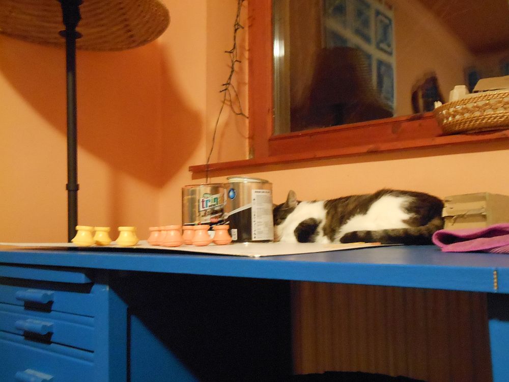 Itt ebben a kuplerájban egyre gyakoribb, hogy embertervez (én), aztán másvégez (Isten, másik ember vagy valamelyik macska). Tegnap például ennek igen szép jellemző esete ütött be, mikor elindultam, hogy rákenjek a fiókgombokra egy újabb réteg festéket (ez egy folyamatban lévő projekt, ha a végére jutottam, be is mutatom), aztán ezzel találtam magam szemben, ni: