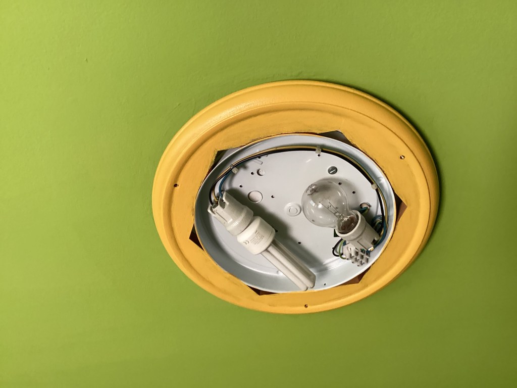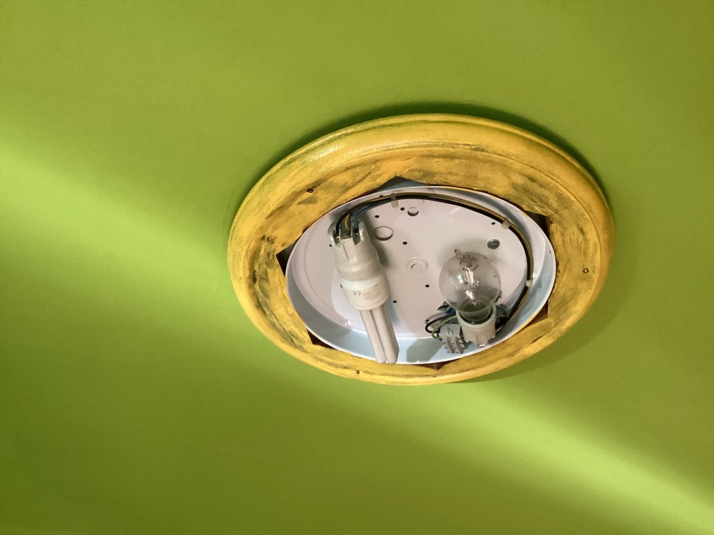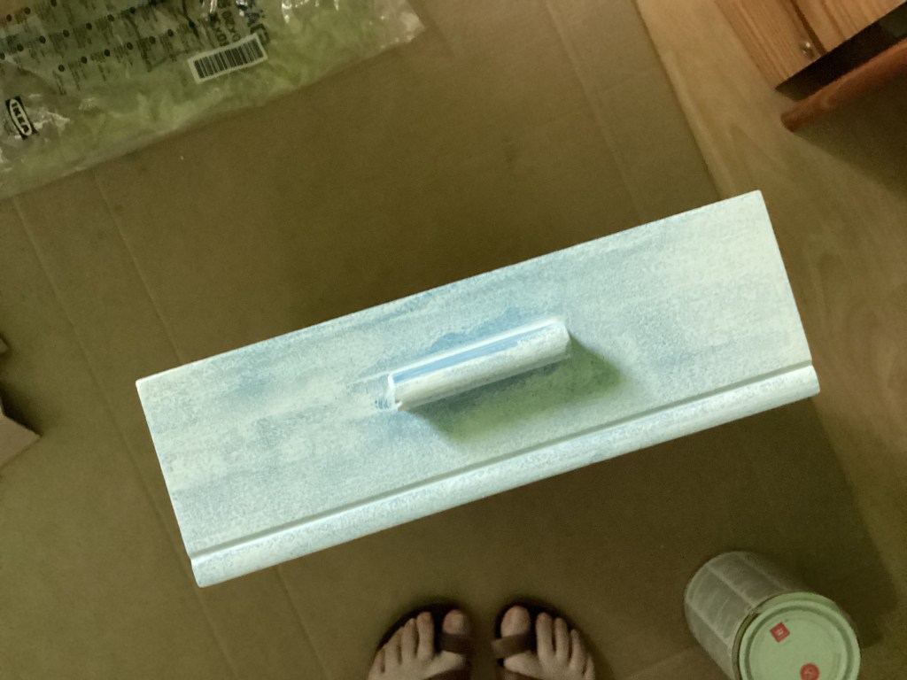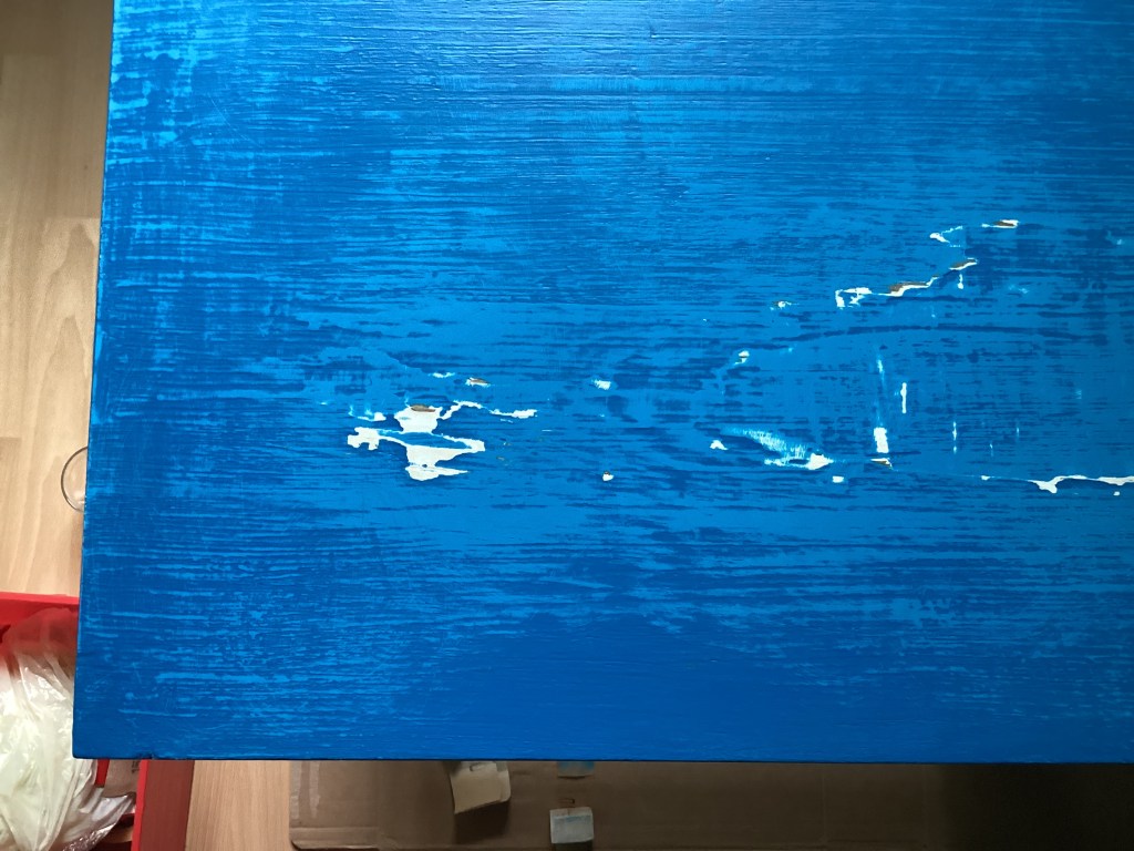 Így hát, miután végre kész voltak a falak meg a lámpa, nekiláttam. Az asztalt már eleve lomtalanításon szedtem össze tizenöt éve, akkor mázoltam le kékre, és eredetileg is ütött-kopott volt a drágám mindenféle évtizedes sebesülésekkel. Nem is nagyon akartam teljesen tükörsimára csiszolni akkor se, most se, mert hát ennek éppen ez a bája, a kicsit lehordott küllem, de azért egy kis dörzspapírozás ráfért.