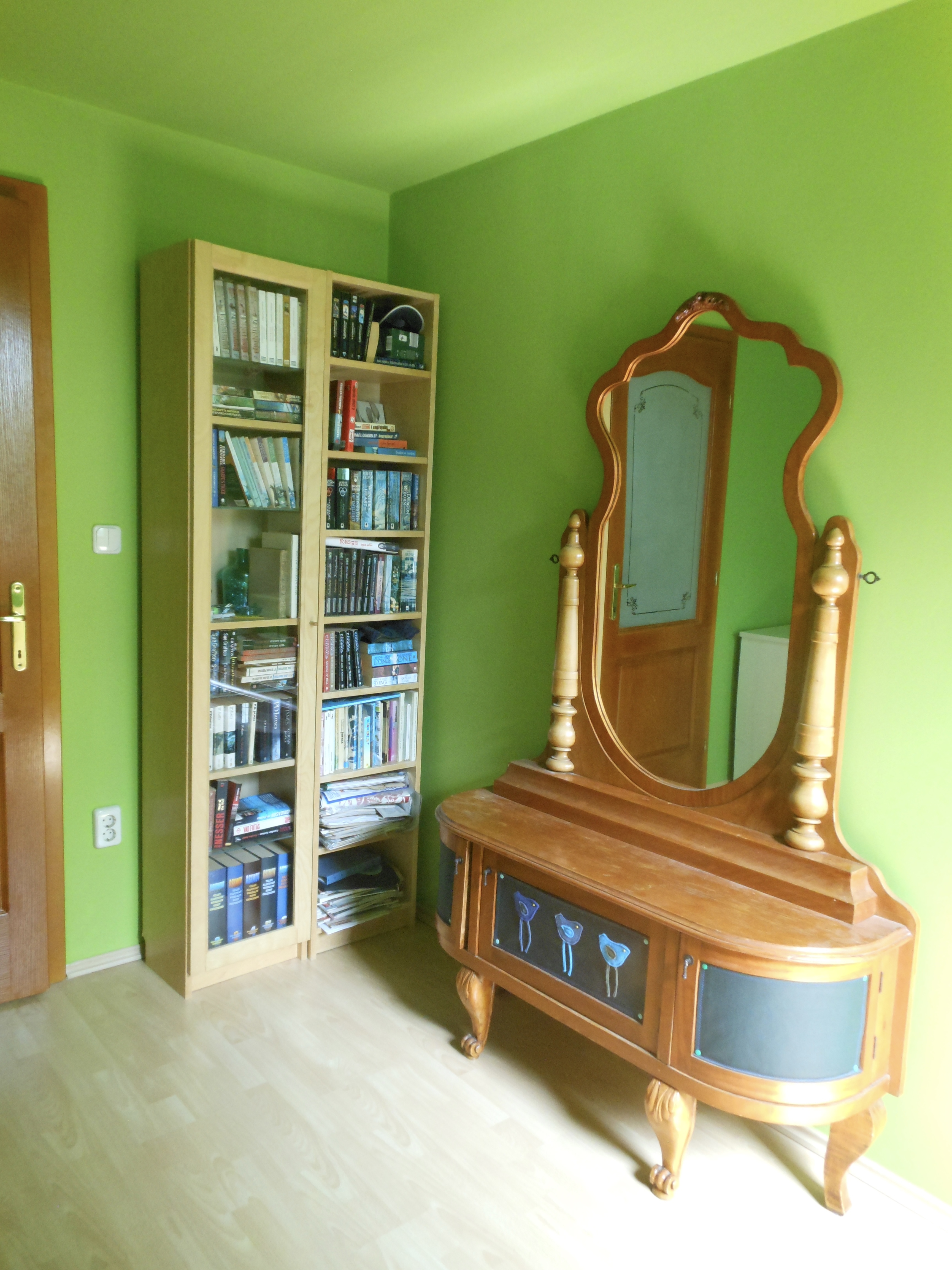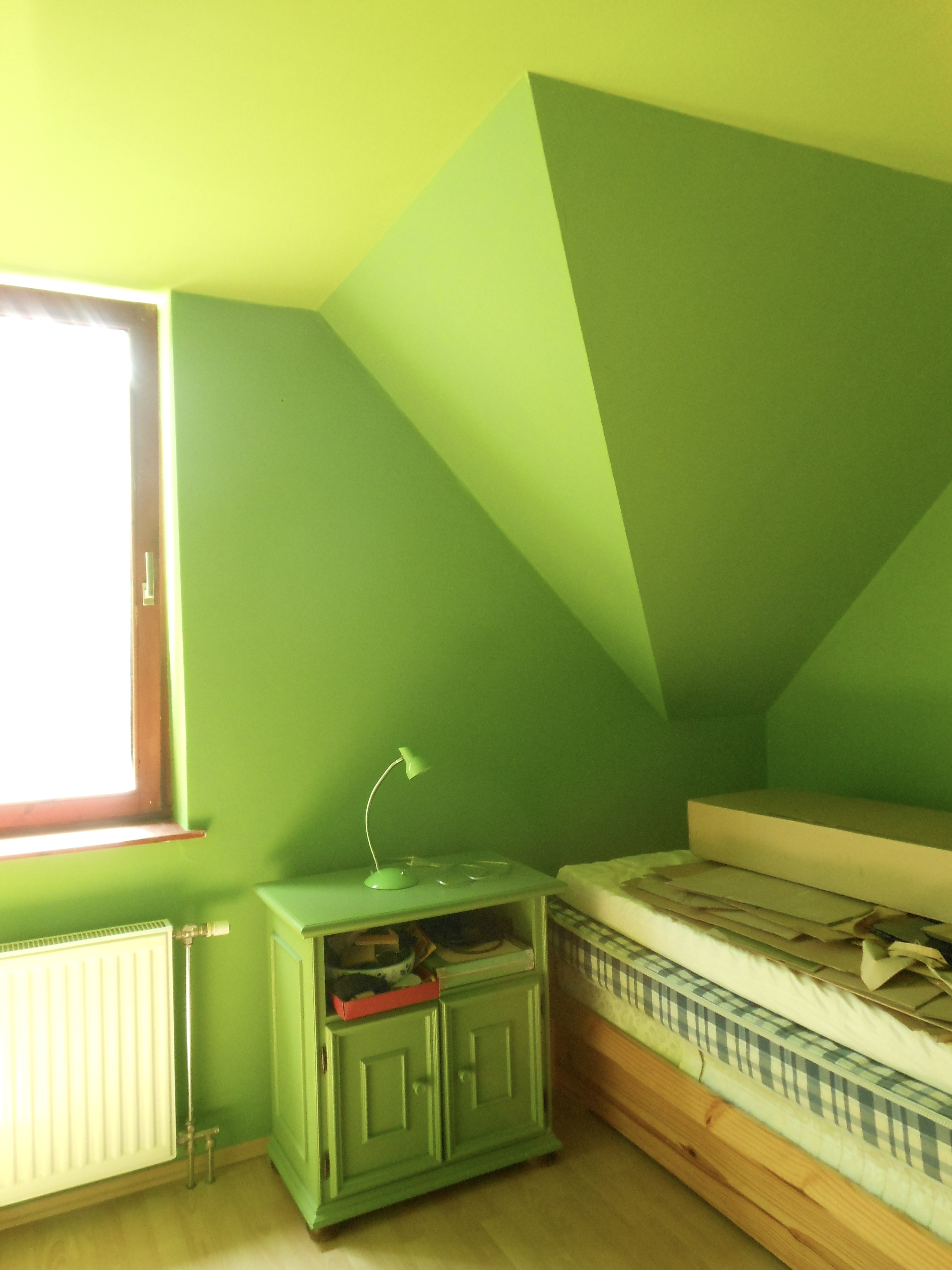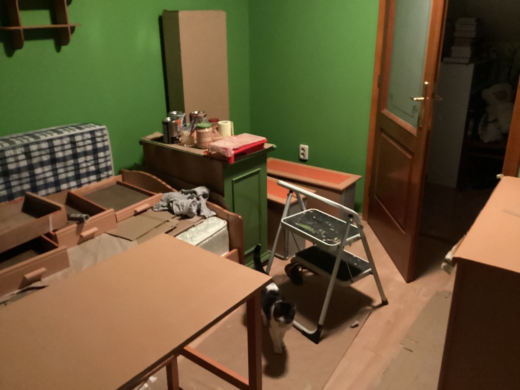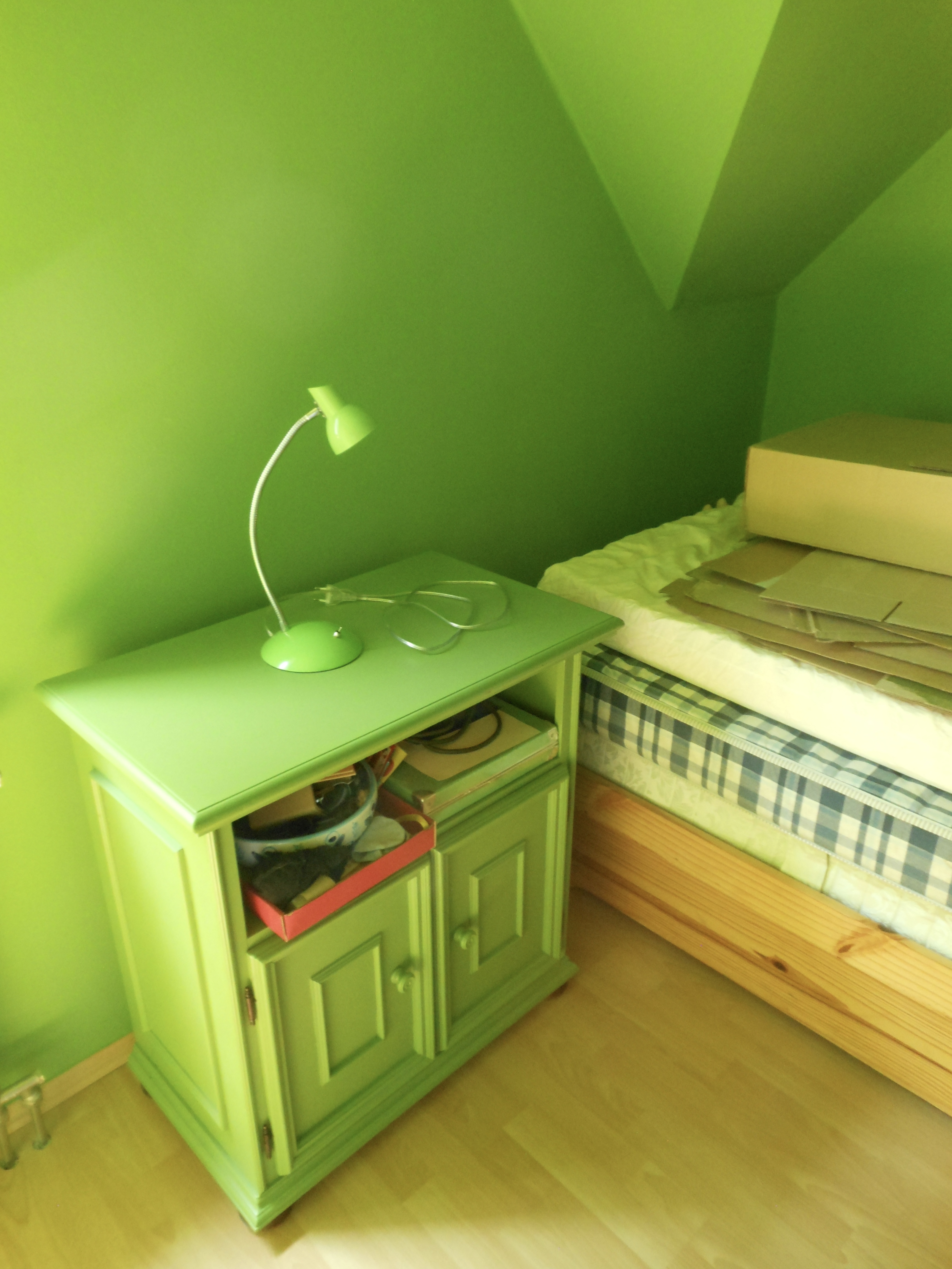 Nos, miután átfestettem a szobát zöldre, az asztal sem maradhatott kék. Nem mintha a kék meg a zöld kombinációjával bármi bajom lenne, de a Borsópüré és a Neon Libafos mellé valami olyan színű bútor kell, ami nem üti ki egészen az ember szemit, ez pedig tényleg félelmetes volt így együtt.
