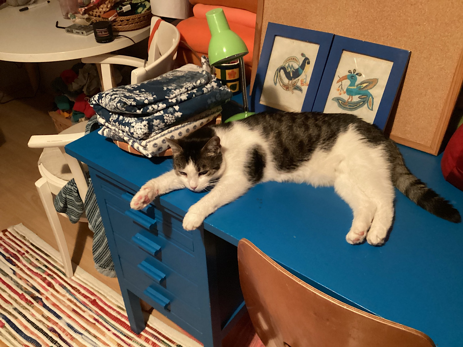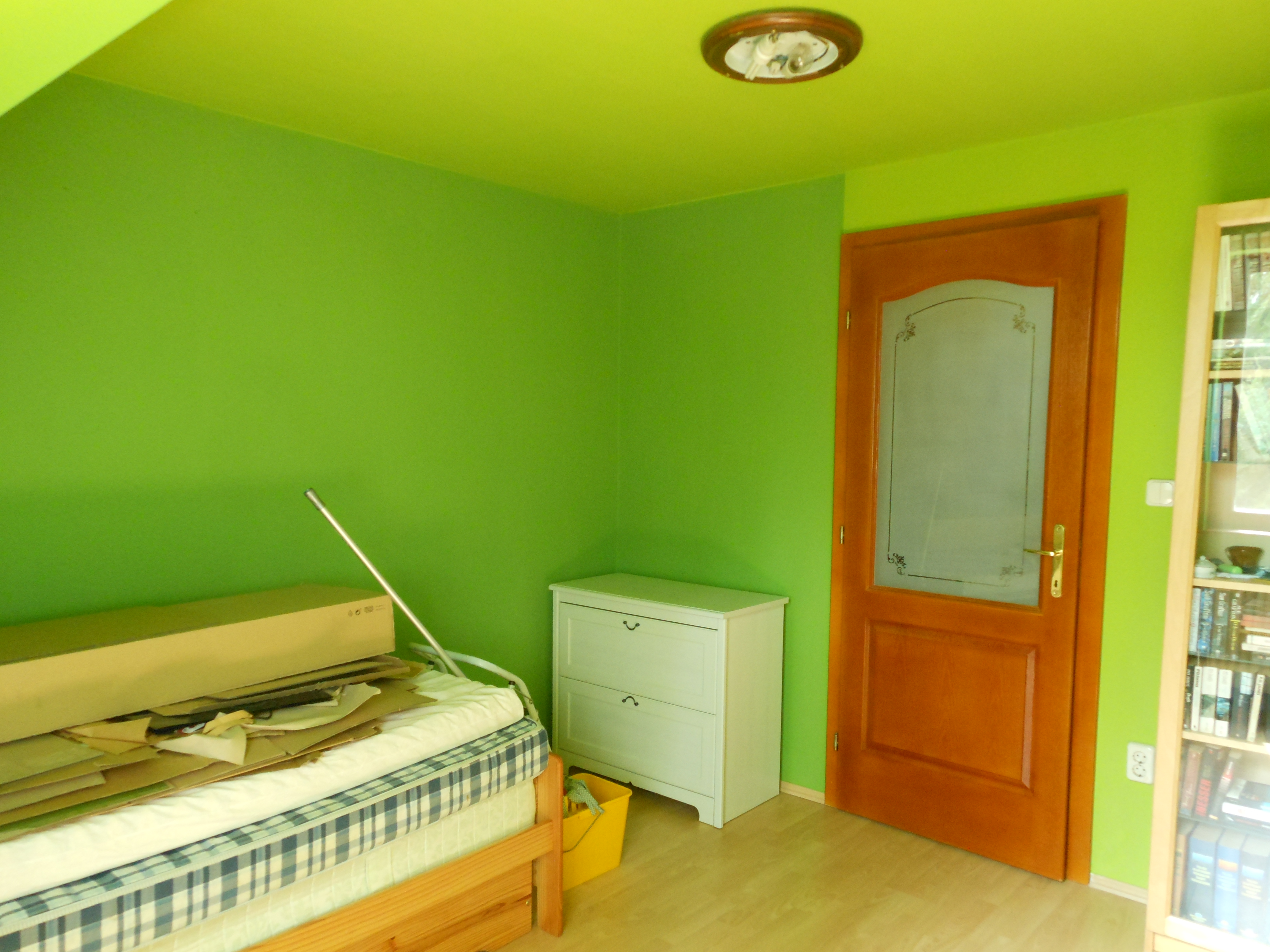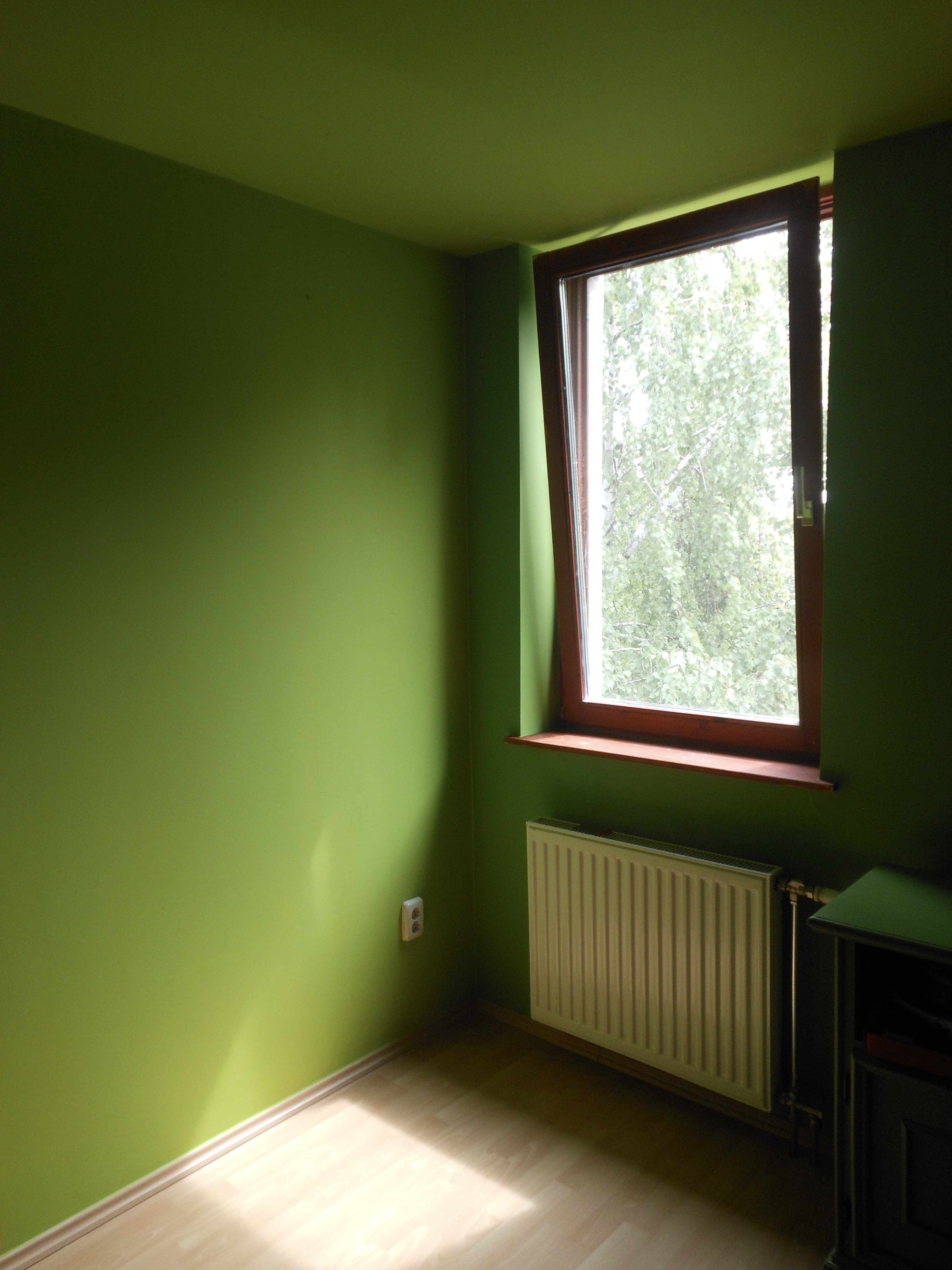 Nos, miután átfestettem a szobát zöldre, az asztal sem maradhatott kék. Nem mintha a kék meg a zöld kombinációjával bármi bajom lenne, de a Borsópüré és a Neon Libafos mellé valami olyan színű bútor kell, ami nem üti ki egészen az ember szemit, ez pedig tényleg félelmetes volt így együtt.