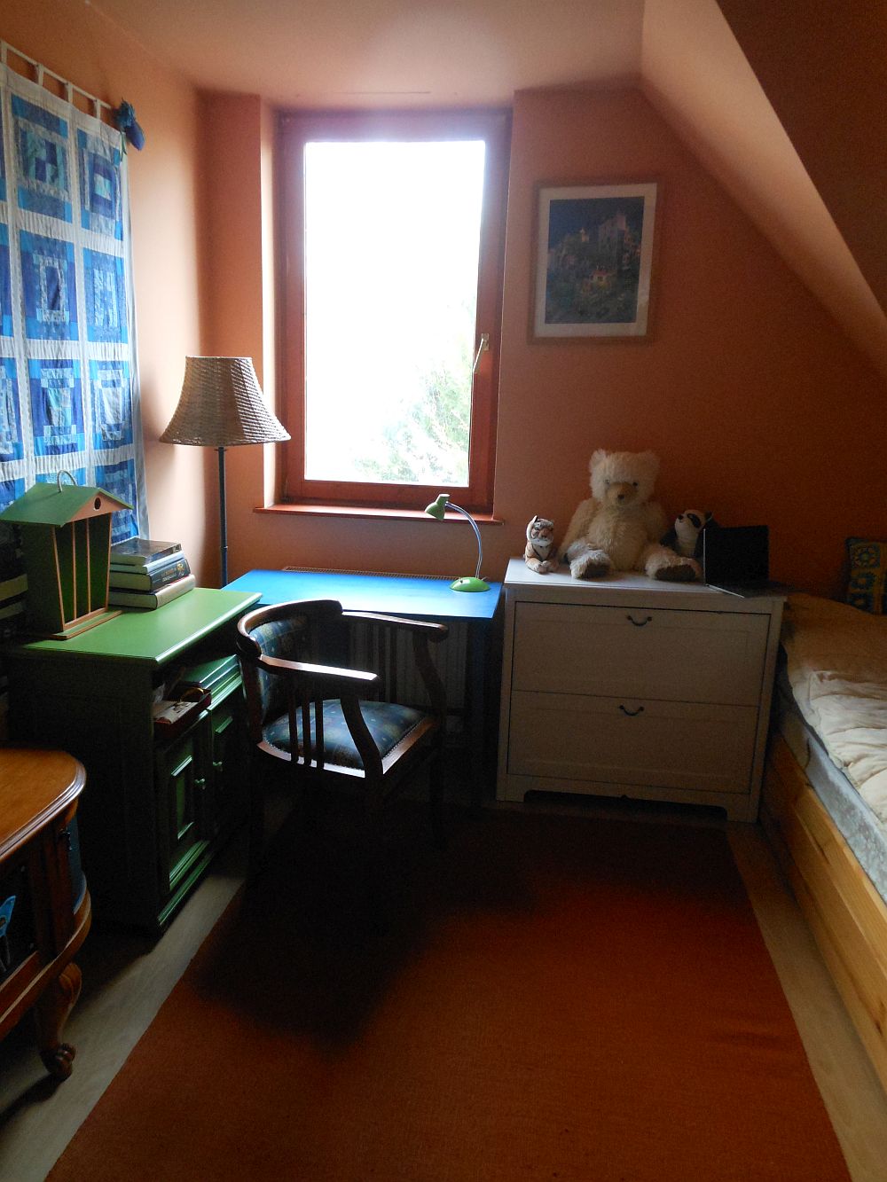 Úgyhogy lekentem erre a barackosbézsre az asztallapot és a fiókokat, narancsszínűre a kihúzható kis írólapot,