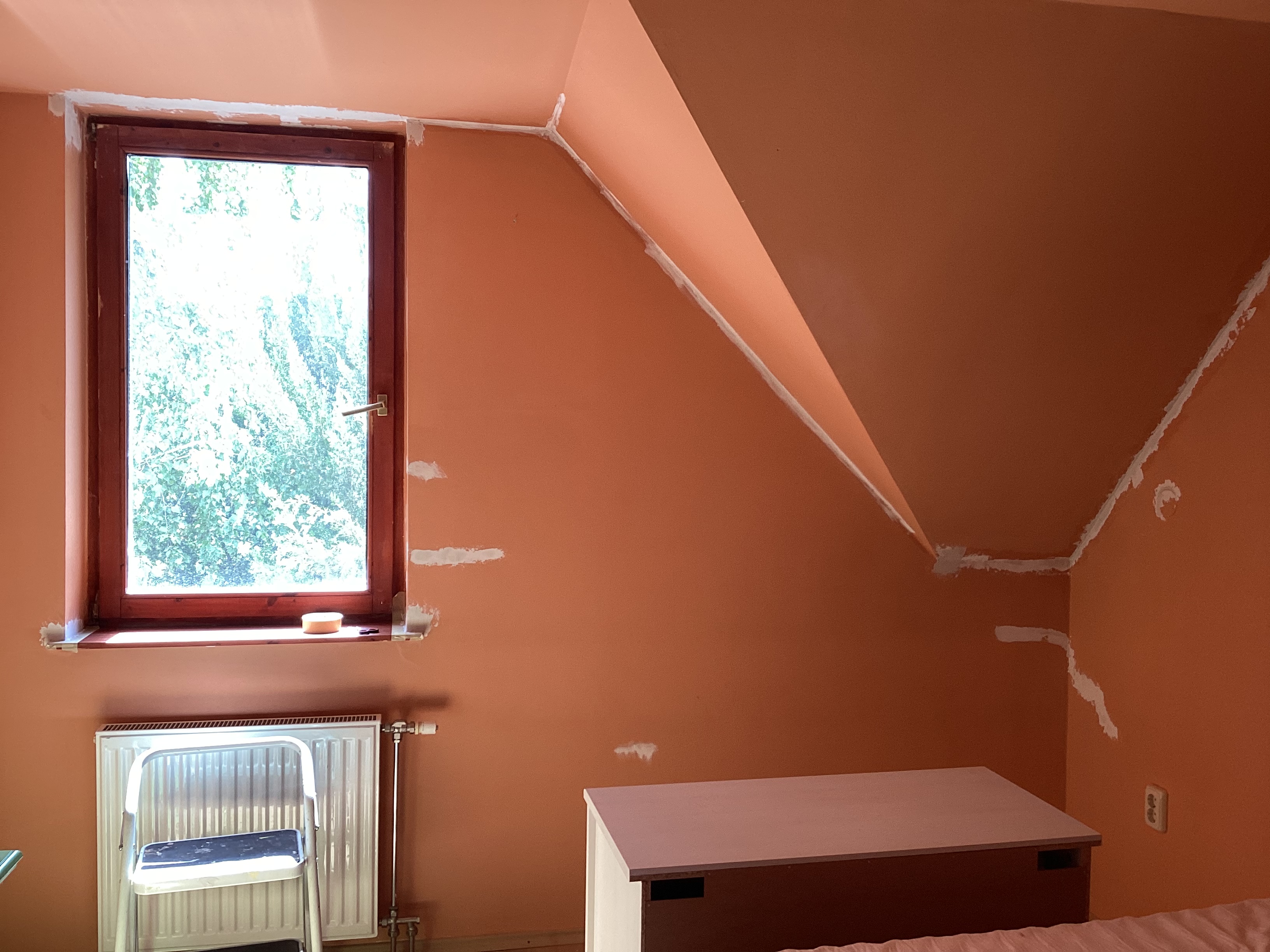 A kevergetés eredményeként én valamilyen barátságos barackos bézst szerettem volna látni, ehhez dobtam összes a sötétnarancsot a világosszürkével. Húúú. Az első szín, amit sikerült kikevernem, a jóóó vastag olajfestékkel bekent retró konyhaszekrények színe lett. Belezúdítottam egy további adag narancsot, ettől meg olyasféle eredményt kaptam, mint a vakolat olyan hölgyek arcán, akik Vlagyivosztokban strichelnek az utcán. Közben meg jöttek-mentek a napok, és egyre több lett sarokban a dzsuva, mert persze nem csak az asztalt festettem le, naná hogy nem, viszont a többire majd később kerítünk sort, mert ott plusz merényletek is vannak-lesznek.