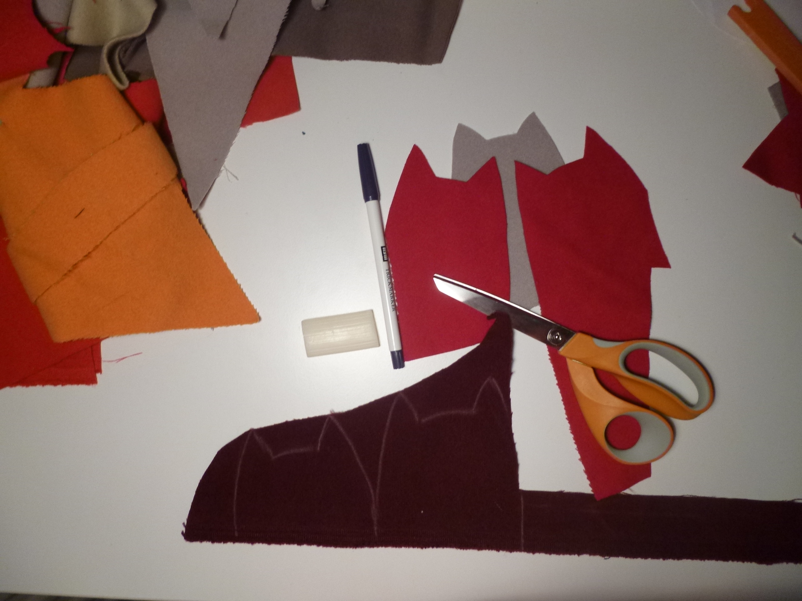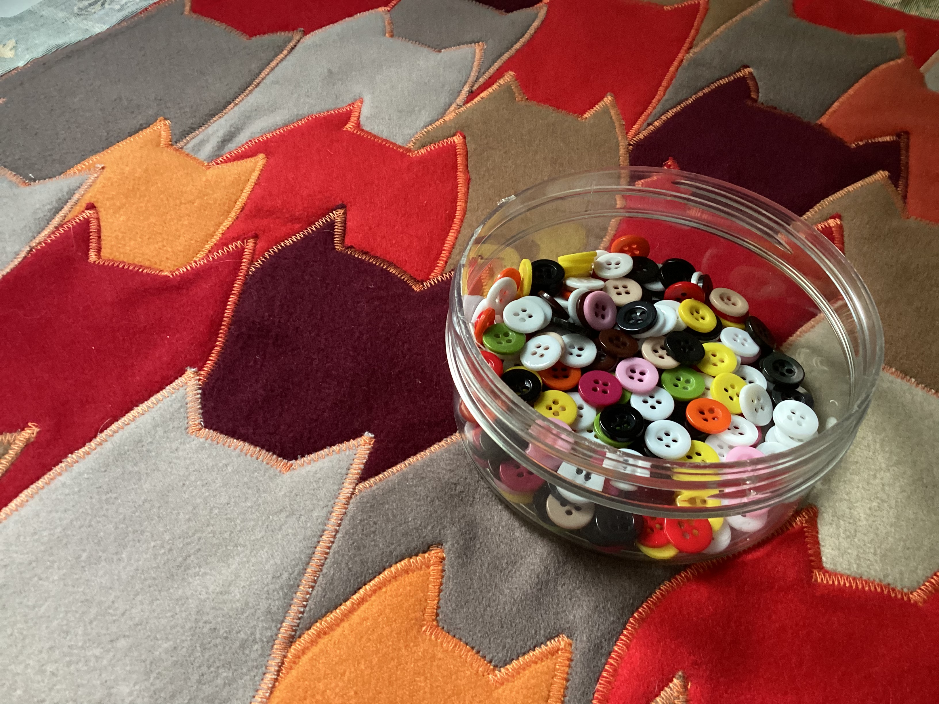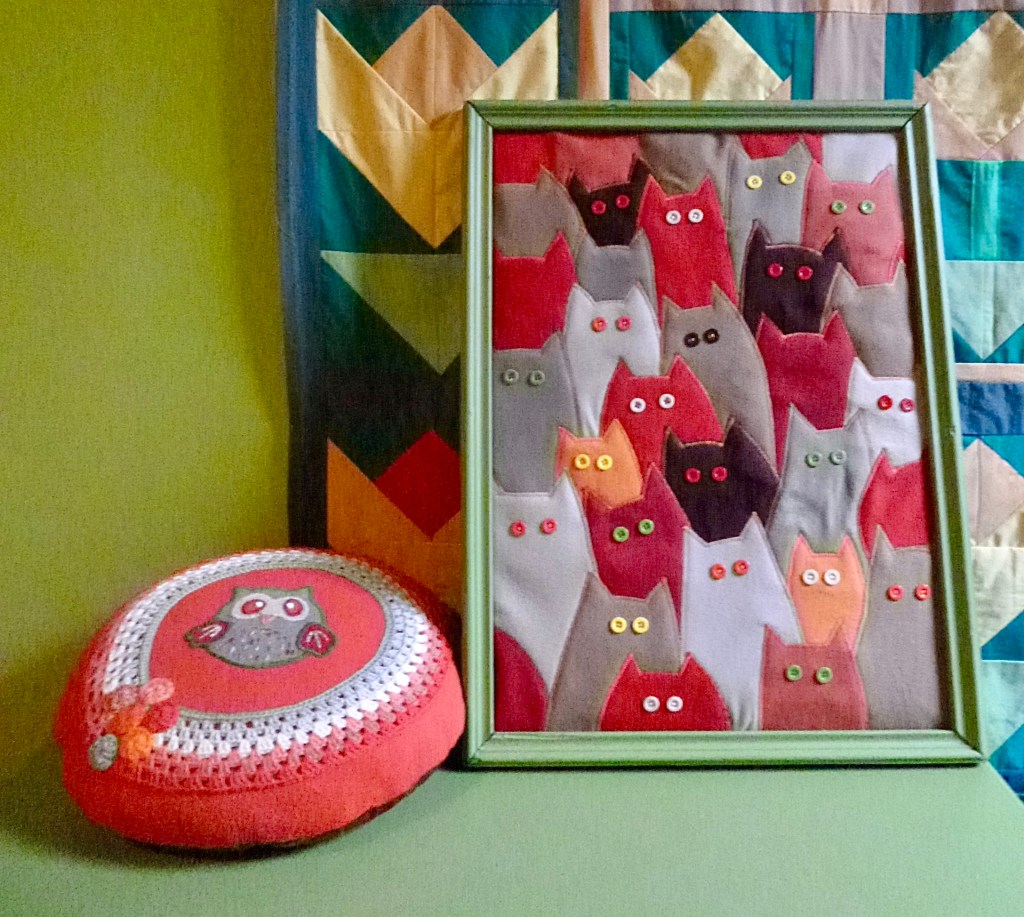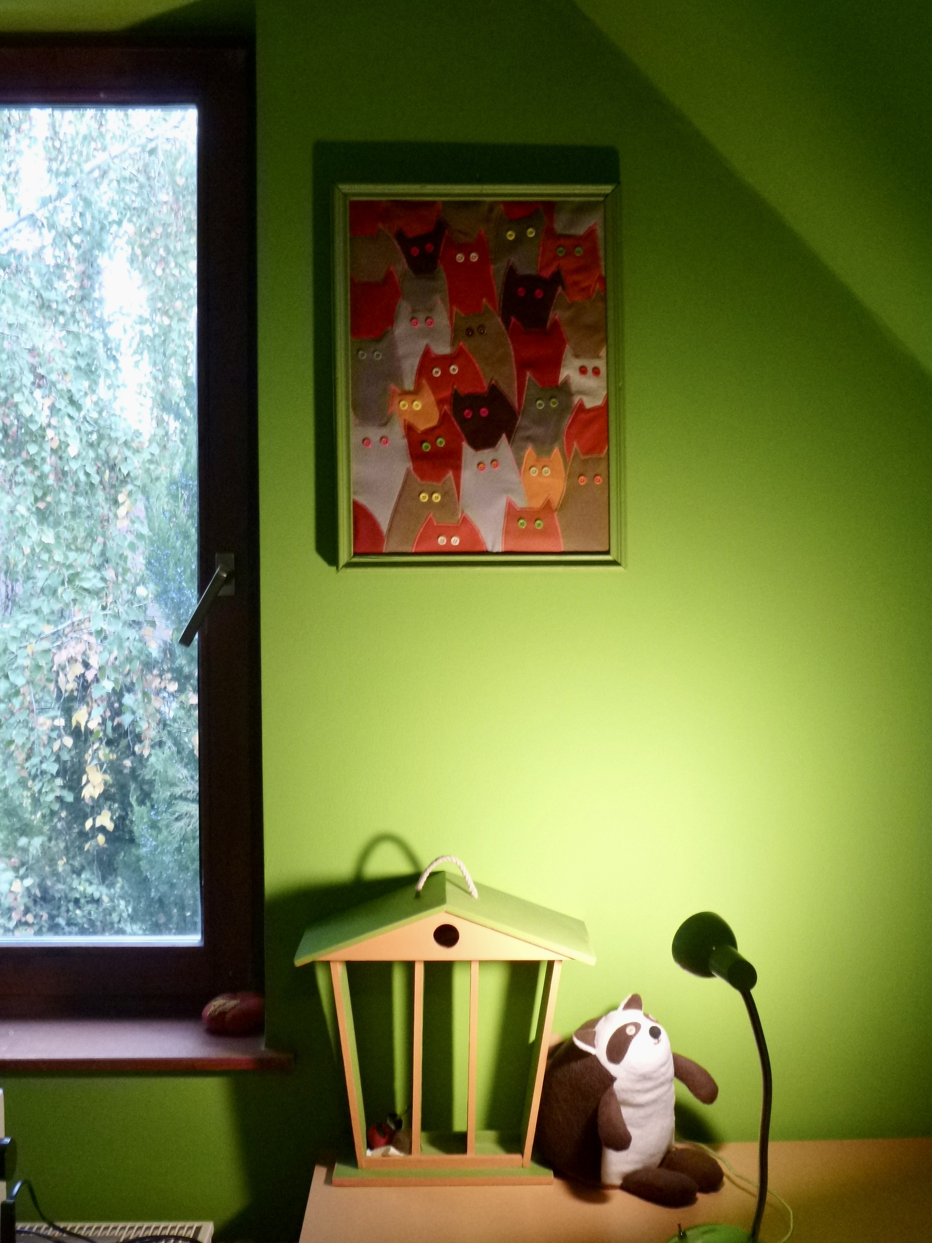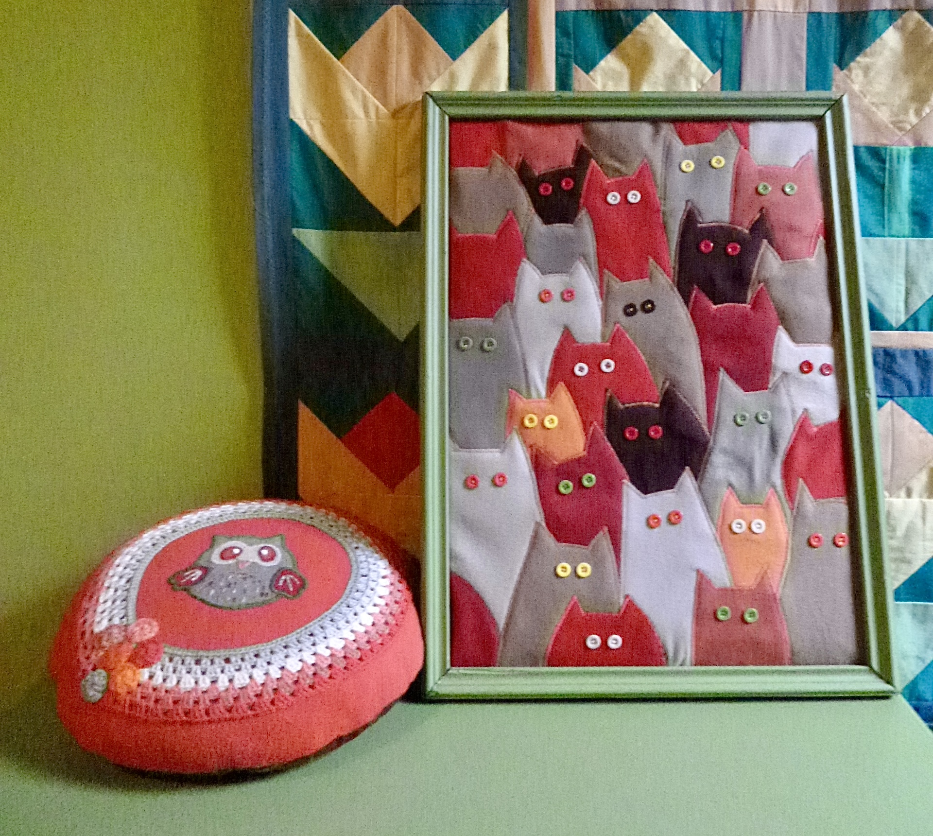 A fények ilyenkor délutánra már nem a legjobbak, de azért teccik érteni, mi volt a terv. A kiindulópont amúgy nem a tegnapelőtt látott cicás sál volt, hanem egy szeptemberben készített cicás kifestő. A továbbiakhoz meg nem kellett más, csak kabátszövet-hulladék, egy zöldre befestett régi képkeret, Erik, színes gombok a kínai bótból, egy erősebb kartonlap és némi maszkolószalag.