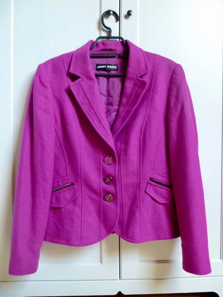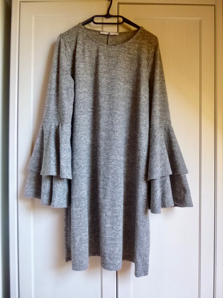A legfelső gombja hiányos, de az ilyesmik miatt én nem hagyok ott ilyen csudálatos színű tárgyakat, meg aztán amúgy is annyi gombom van, mint a nyüves. Ezt a ruhát sem hagytam ott csupán csak azért, mert térdig érő duplaharangos ujjai vannak,