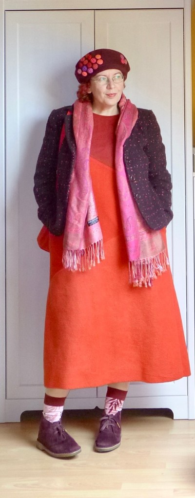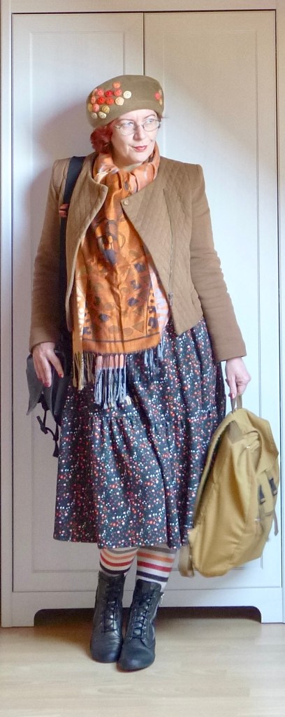 Na, lássuk csak, miért megy be az őtözködős blogger novemberben a turkálóba? Puhaaa meg meleeeeg holmikért. Fotózhatatlanul mustársárga színű zseníliapulcsi, pöttyös pizsifelső, 54-es méretű polár nagyböhöm aranyos téli házikóval az elején, olajzöld leggings (ilyen színben még nem volt), meg egy virágmintás ruha, zsebekkel.