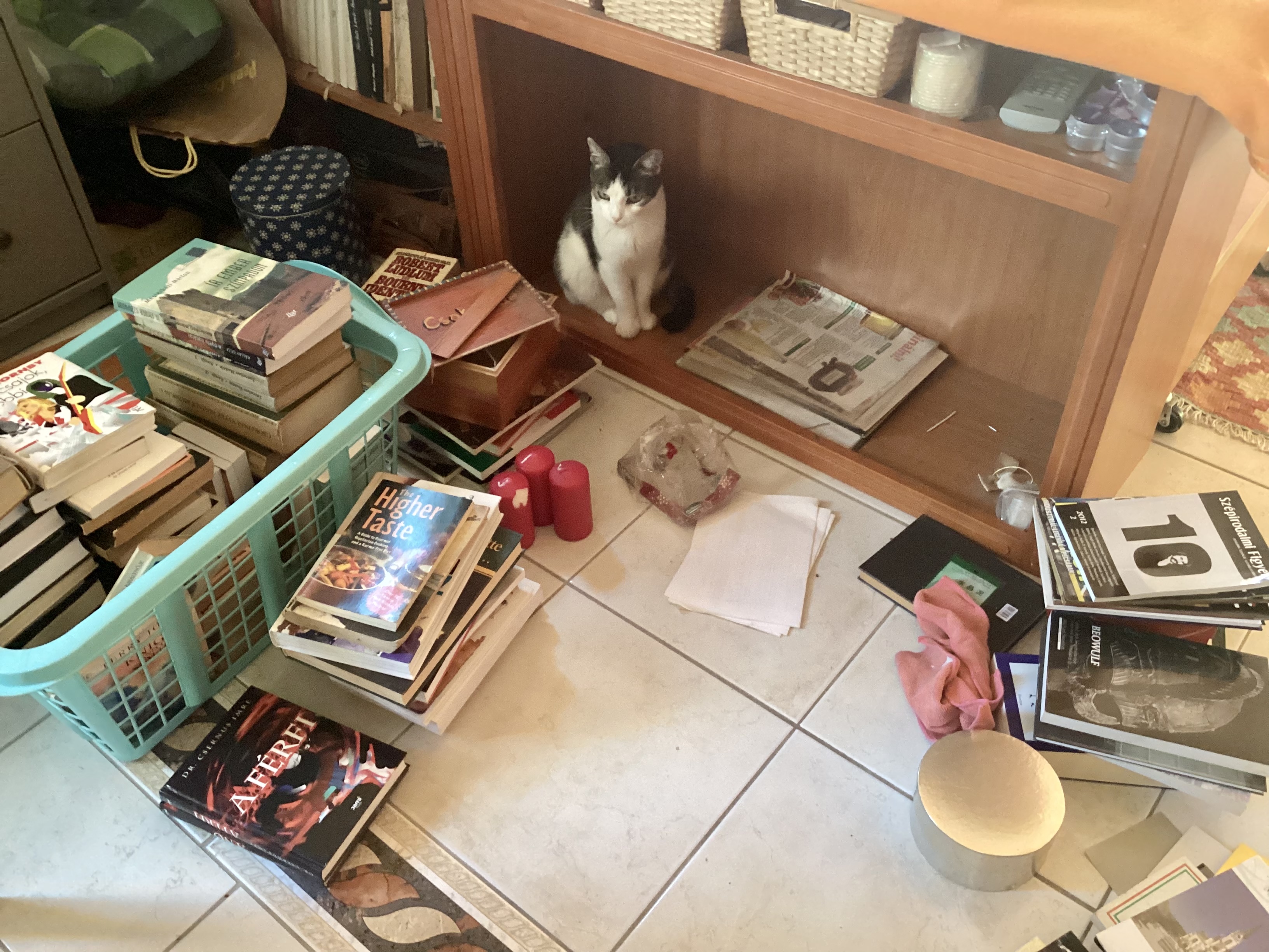 Utána még ráragasztottam a dögök aljára némi mozgatáskönnyítő öntapadós posztót (not pictured), aztán lecsutakoltam mind a két példányt, és visszapakoltam rájuk (portalanítva!) mindazt, amit nem szelektáltam ki a folyamat alatt. Közben volt amúgy még néhány kör “hátulsó pár előre fuss” a lakásban található más polcok bevonásával, úgyhogy most jelenleg spóroltam magunknak kábé másfél folyóméter pakolóhelyet, nem mindet itt, de értitek.