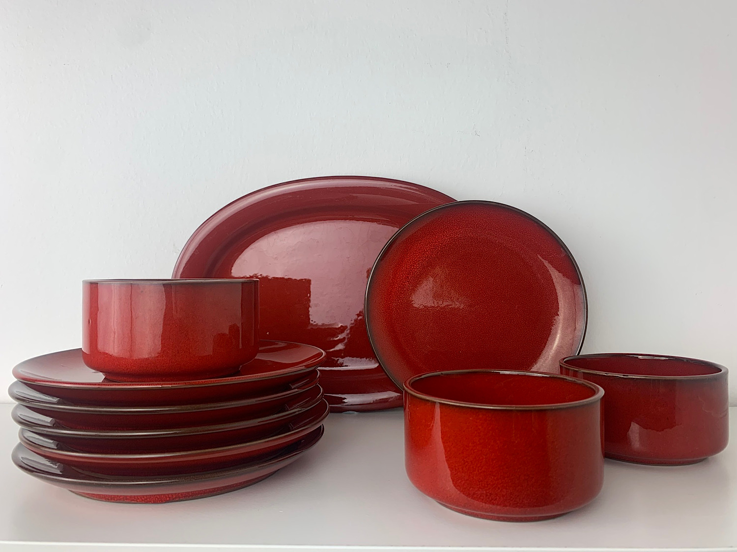Az külön poén, hogy például itt az alábbi képen háromféle forrásból vannak a pirosok (anyósom egyszer vett nekem ajiba a WAMPon néhány remek Konda Brigi-kerámiát, tavaly nyáron Grazban egy Carlában megcsíptem egy csudálatos kupac piros akármit 12 vagy 13 euróért, plusz ezek itt most a Second Chance-től), de mind passzol egymáshoz.