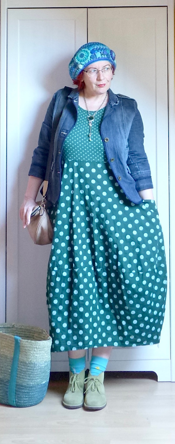 Végre kegyes hozzánk az időjárás, megengedte, hogy belecibáljam magam a “negyven fölötti szentendrei asszony piacra megy” egyenruhába, ami farmerdzseki+buggyruha+csüngü kombinációt jelent. A felemás zokni (most már hat év gyűjtögetés után van belőle vagy ötven pár, alig maradt a készleteimben olyan zokni, ami nem felemás) meg a horgolt sapka (a hajam kriminális állapotban van, jövő héten fodrászhoz viszem) csak ráadás.