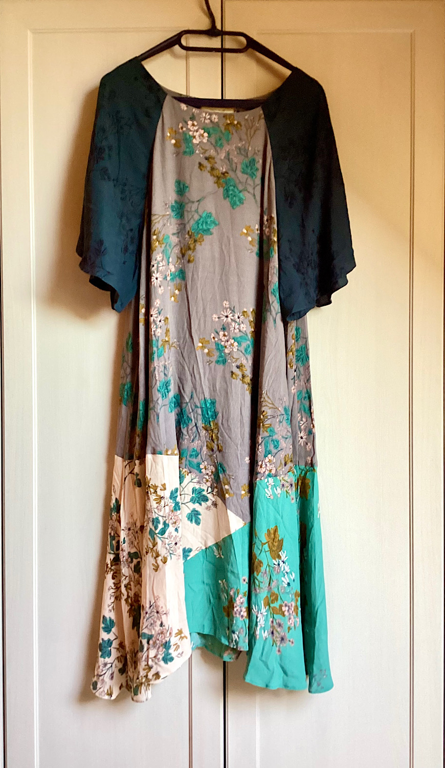de tényleg: egy úgynevezett colorblocking technikával készült cucc, ami annyit tesz, hogy összesen négyféle anyagból van összevarrva. Ráadásul még mindegyik anyag önmagában mintás is. Egen, ezek azok a ruhák, amik azt mondják nekem a turkálóban, hogy “hellóóóó”. Na mármost lehet, hogy mindenkinek azt mondják, de én le is veszem őket az állványról, aztán gyere haza a mamához.