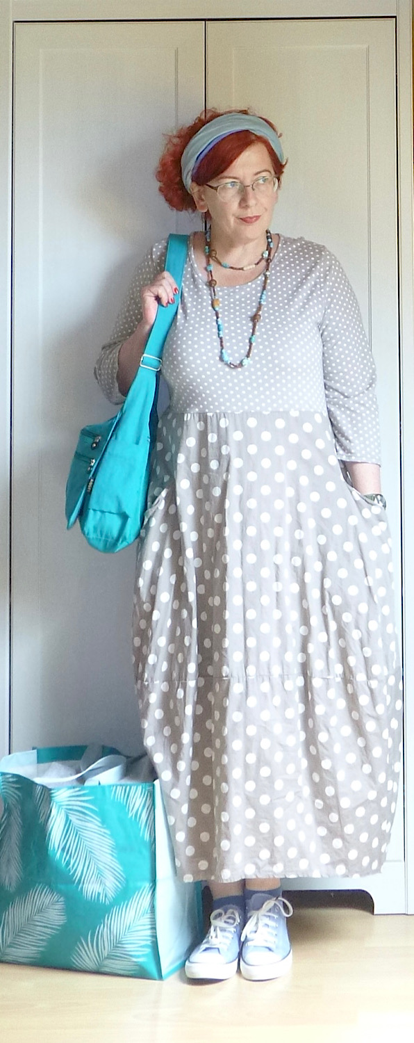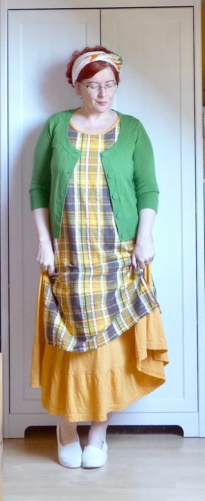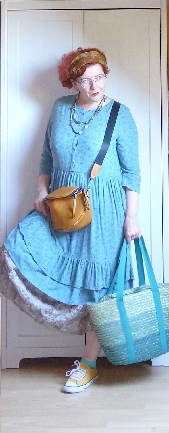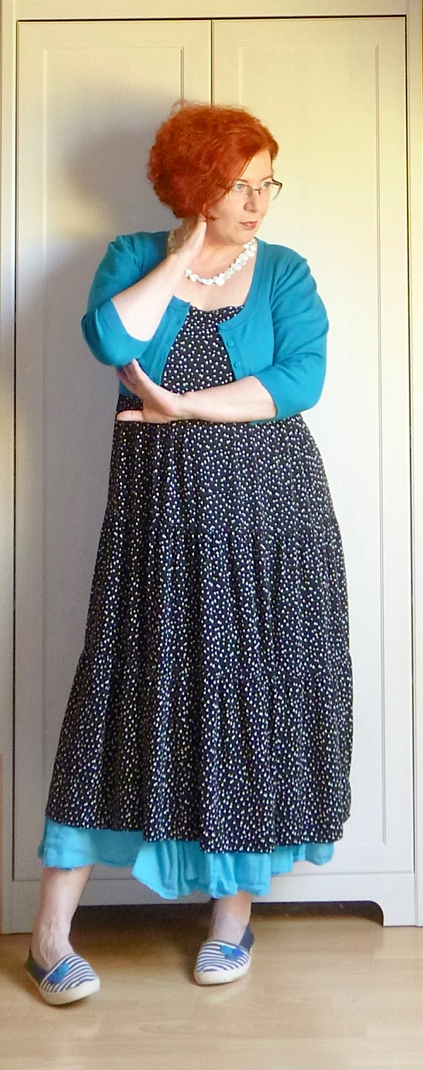 Piacra menni tehénkergető ruhában, alatta egy plusz szoknyával, felemás zokniban és felcsüngüzve, mert miért ne. Jah, ez vagyok én. A pózt nem tudom megmagyarázni, de az enyhén mániás tekintet amiatt van, mert a RK ma hazajön, és én a) nem tudom, mi a nyimnyámot adjak neki vacsorára, b) el kell mosogatni mindazt, amit itt-nem-léte alatt szolidan besuhintottam a mosogatóba. Esetleg ott hagytam a konyhapulton.