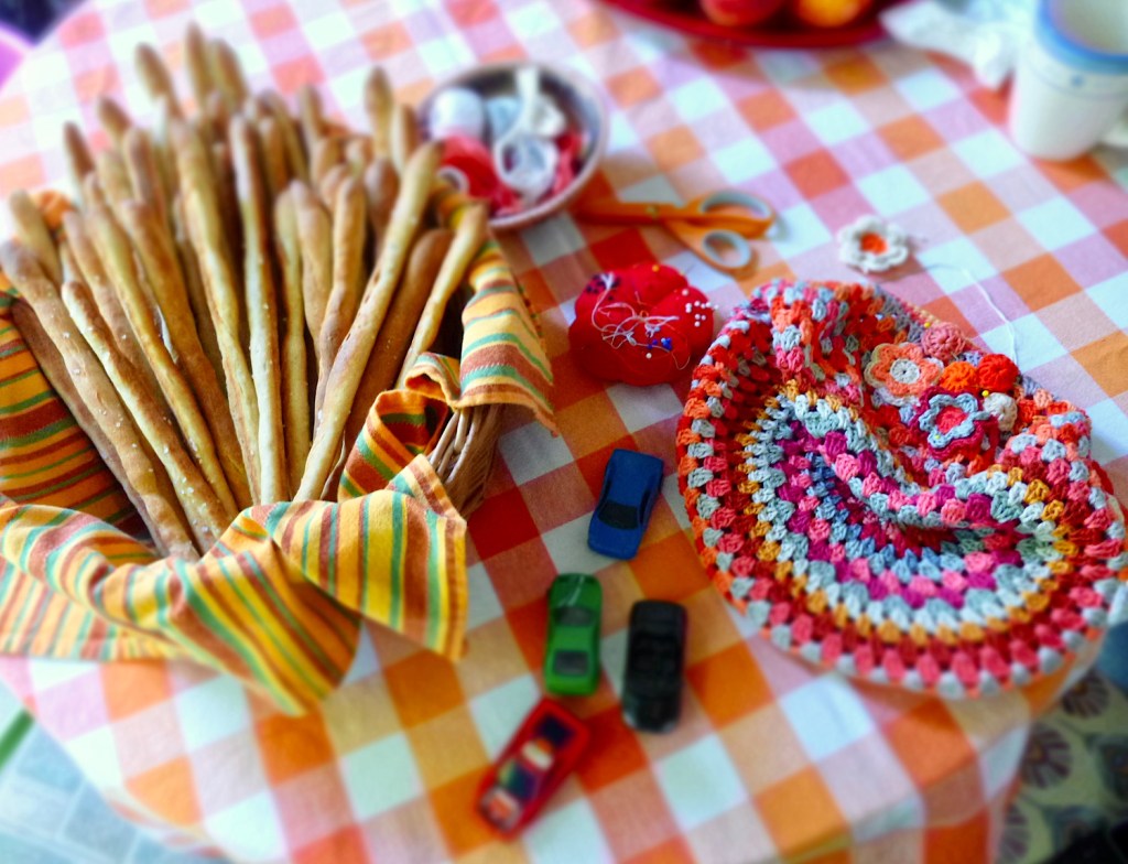 Három tepsi kenyérrudacska (egy negyedik tepsinyit a RK visz magával), a sapka, amin dolgoztam (azóta már elkészült), plusz a helyi zsibin vásárolt matchboxok a legifjabb résztvevő számára.** Ott azt a feketét sikerült is azonmódulag gajravágnia, egy különösen vad rali közben leszakadt az alváza és tengelytörést szenvedett. Azzal vitték el, hogy “majd apa megjavítja”. Én mindezt angyali derűvel szemléltem, mert onnantól, hogy odaadtam, már nem az én reszortom, mit csinál vele, meg különben is matchboxot én három fontos kritérium alapján szoktam megvenni a zsibin: a) legyen meg és forogjon mindegyik kereke, b) legyen elég masszív, lehetőleg fém, c) ne kerüljön többe háromszáz forintnál. Mint látható, a kritériumaim leginkább azt célozzák, legyen minél nehezebb gajravágni a kiskocsikat, de ha véletlenül mégis összejön, hát akkor is veszett több Mohácsnál.