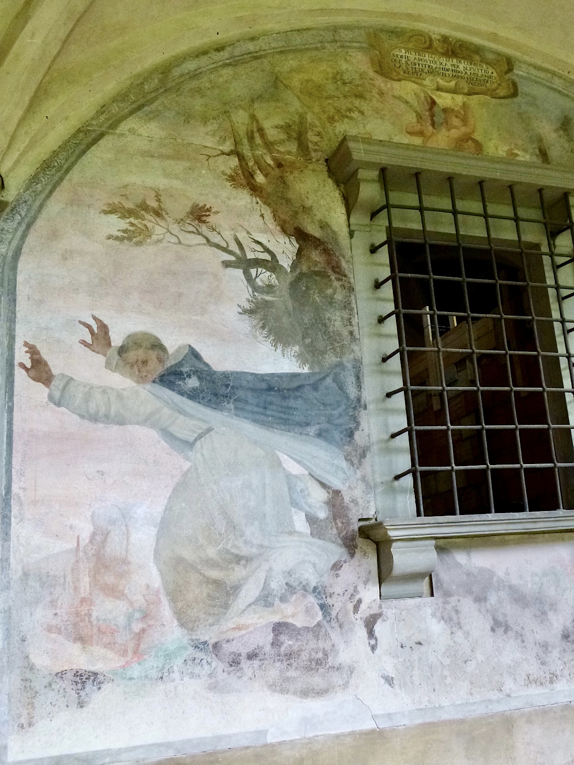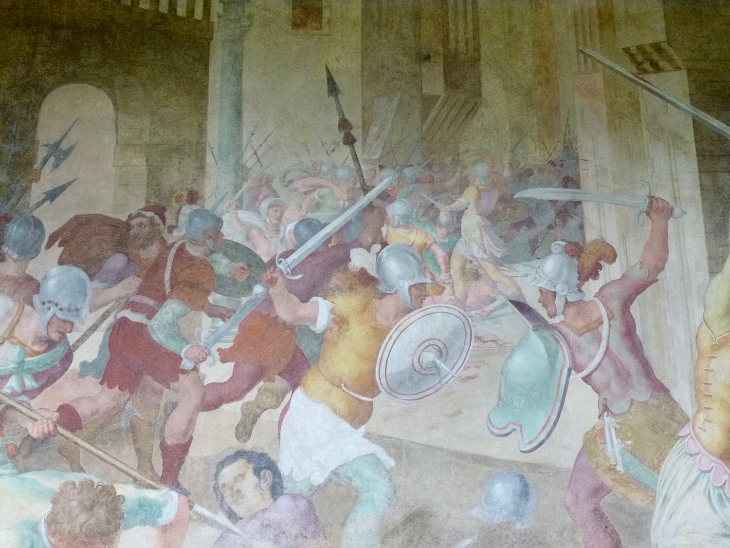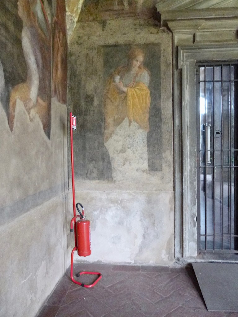 Másutt egy egészen épen maradt tizenhatodik századi freskót bársonykötelekkel kerítenének el, itt meg eléje baszarintják a tűzoltó-készüléket, mert ugyanazon az udvaron van még további ötven darab freskó, és azok nagyobbak és jobb állapotban vannak.