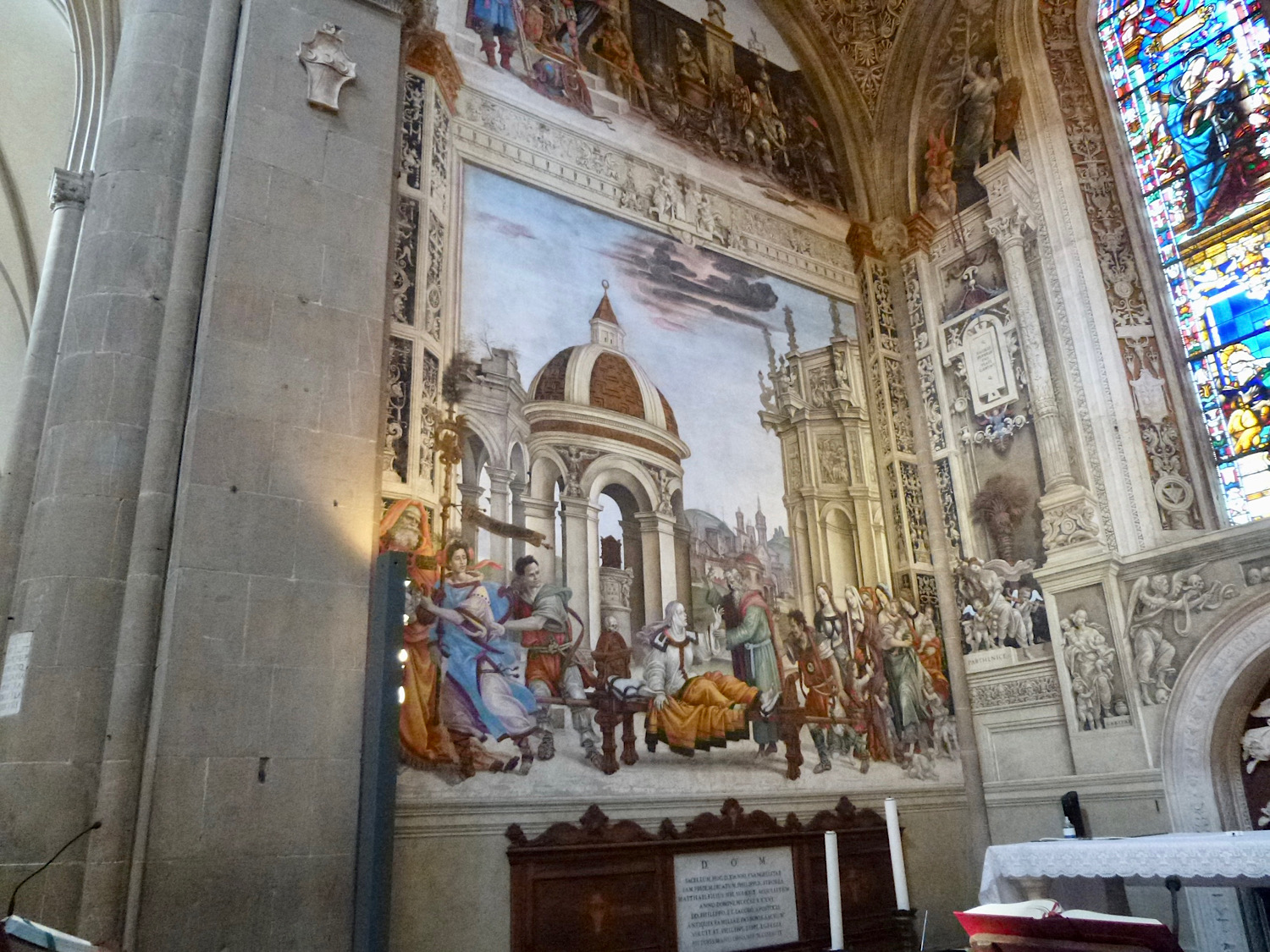 A templomban önmagában is el lehetne tölteni három-négy órát csak azzal, hogy az ember végigböngészi az összes akármit, amit a tizenharmadik század óta belehurcoltak és -építettek. Itt-ott szinte látod magad előtt a mestert, amint a fejét vakarja, na ugyan hol találunk egy üres likat, ahová besuvaszthatnánk egy Sforza sírját vagy egy Ghirlandaio-freskót.