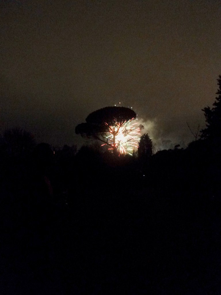 Mivel ittlétünk óta legalább tucatnyi random tűzijátékot tapasztaltunk meg a közelünkben, főként a fejünk fölött Fiesoléban, és a karácsony is meglepő mennyiségű durrogtatást tartalmazott, az éjfélre is voltak tippjeim, mivel fogják tölteni a népek. A La Casina igen érdekesen van beágyazva a környezetébe, a durrogásokat elég jól, de nem fülrepesztően hallani, és ugyan nem mindig látni, de az is előfordul. Mackó az eddigiekre rá sem hederített, és bíztam benne, hogy ezúttal is ez lesz. Ez is lett, hála a pipéknek.