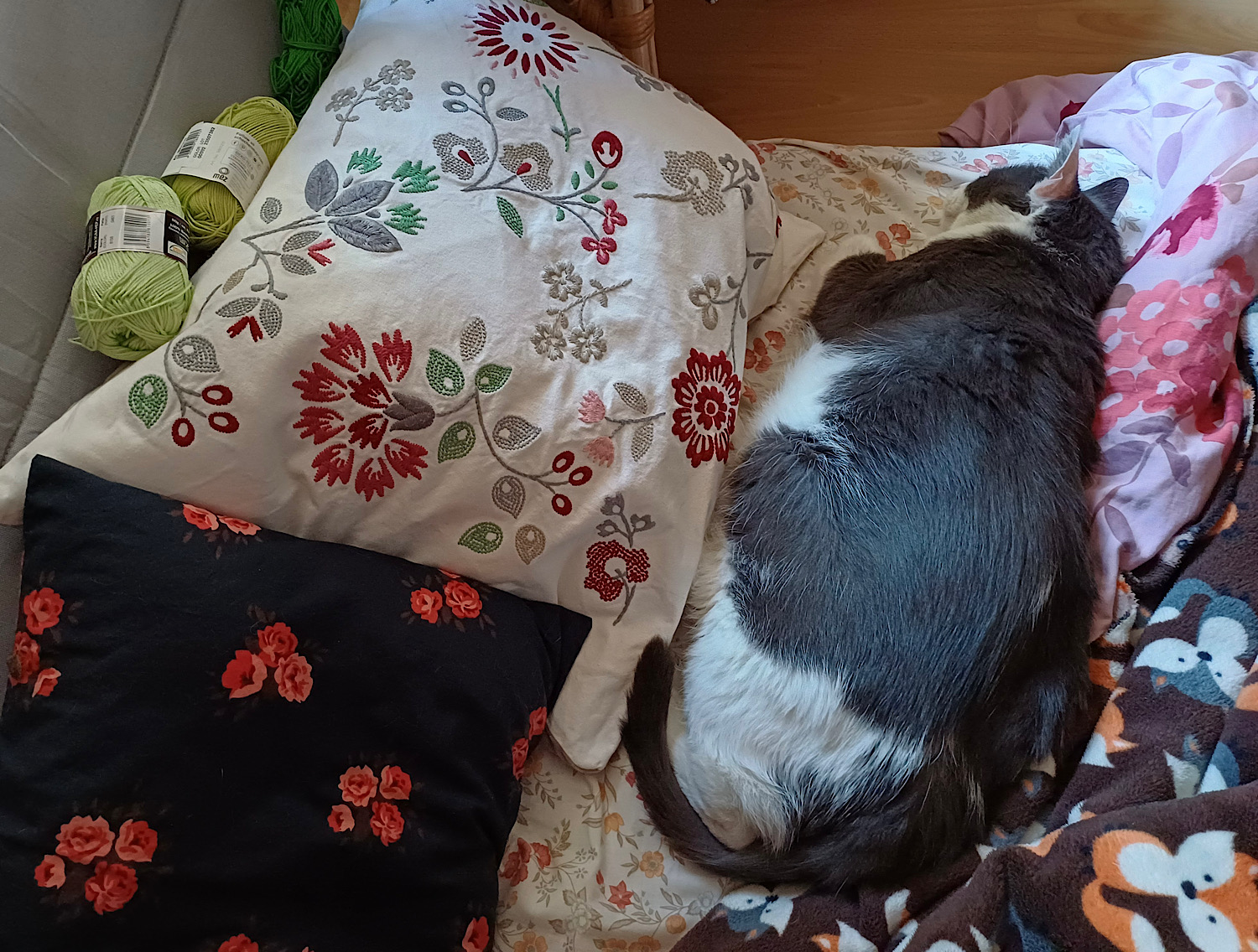bár a kriminális éjszakámhoz ő is hozzátette a magáét, ott azokat a gombolyagokat például ő pofozta le a polcról ötkor, egyenest a fejemre, hátha ettől felkelek, és adok neki enni. (Felkeltem, persze. Ott azon a polcon még egy csomó fonal van, nem hiányzik nekem, hogy az összest ledobálja.)
