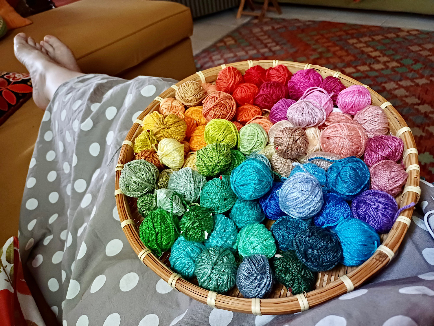Az irodámból még jött hozzá egy tűpárna tele hárászvarró tűkkel, három további gombolyag, valamint öt további olló, köztük egy balkezes.
