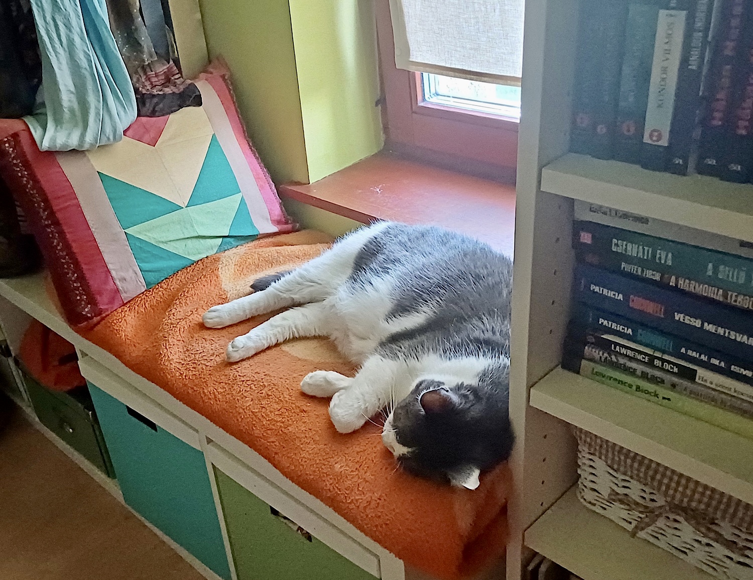 Mára harminchárom fokot jövendöltek kies kis falunkba, úgyhogy a mai napot is szellőztetéssel kezdtem valamivel három után, amiben az volt az egyik fő trükk, hova dugja az ember a macskát akkor, amikor annak kedvenc hálószobájában tökig tárja az ablakokat. Szerencsére Mackó igen alkalmazkodóképes, mindenekelőtt enni akar, és ha már megkapta a nulladik reggelit meg aztán az első reggelit is, talál magának dögölészőhelyet, ha muszáj.