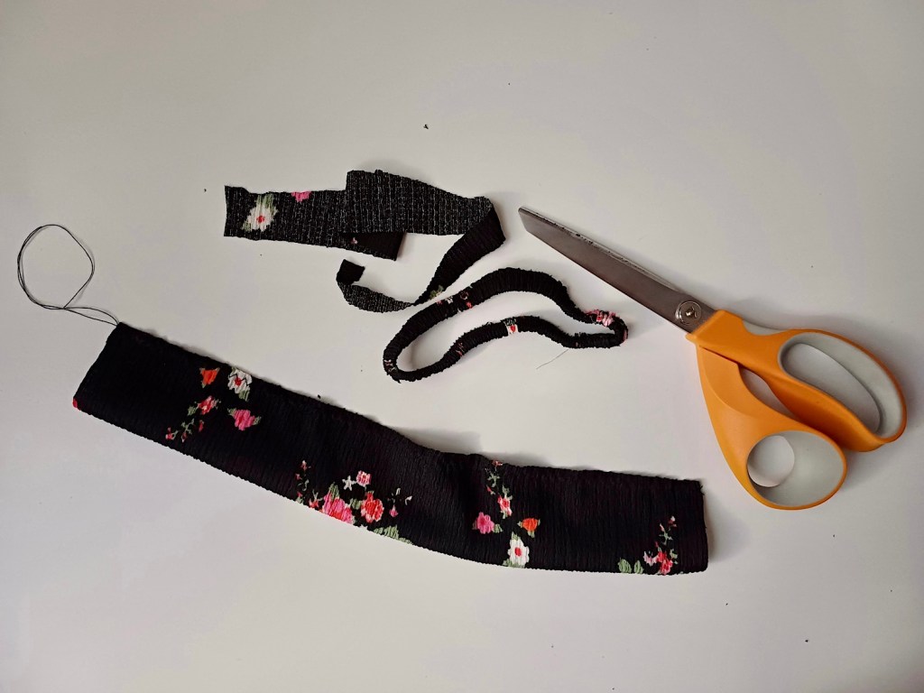 Az ujjakat felhajtottam, begumiztam (erről nincs kép, el tudjátok képzelni), majd a levágott ujjarészből levágtam egy hét centi széles csíkot, félbehajtottam, és összevarrtam.