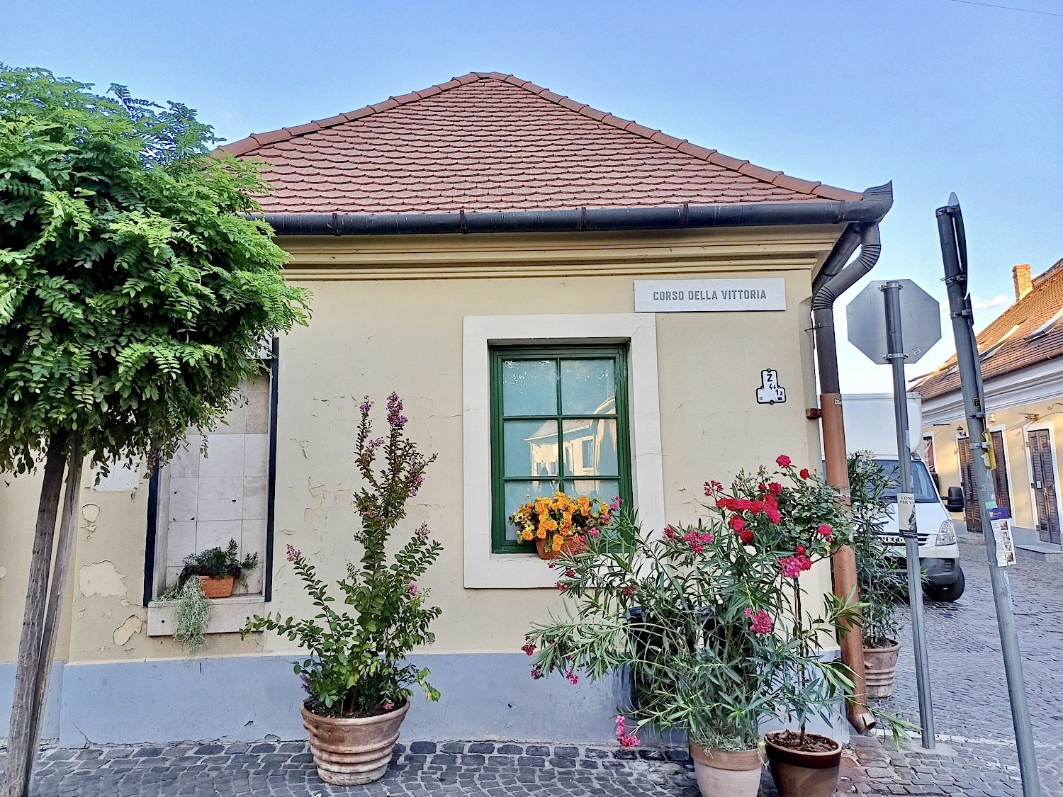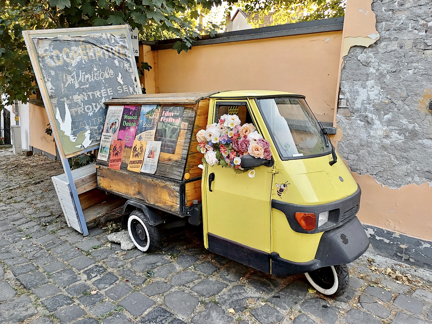 Anyósomék tegnap utaztak el öszves unokájukkal egyetemben Velencébe, nekem meg, bevallom, április óta vannak időnként “menjünk vissza Toszkánába, és maradjunk is ott” rohamaim, így hát különösképpen mulattató volt tegnap este lemenni a városba, ami pillanatnyilag épp egy filmforgatás díszlete – gondolom, már kitaláltátok, hogy Olaszországban. Nyilván a lehető leginkább vicces módon, mű-narancsfákkal és ál-feliratokkal, plusz rengeteg hamis plakát meg cégjelzés, de közben azért mindaz, ami a kamera látószögén kívül van, marad olyan, amilyen. A képtár például öt méter magasáig felismerhetetlen, azon felül viszont pont olyan, mint volt.* Itt-ott sajtos- és kenyereskocsik álldogálnak, amelyeknek a valószerűségéről nem tudok szavatolni, nem jártam Dél-Olaszországban, de pont úgy néznek ki, mint ahogy egy Hallmark-film nézői elképzelik a bályos Szicíliát.