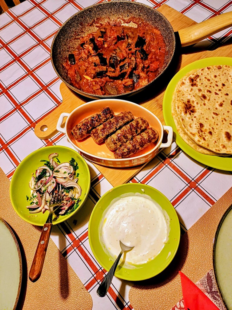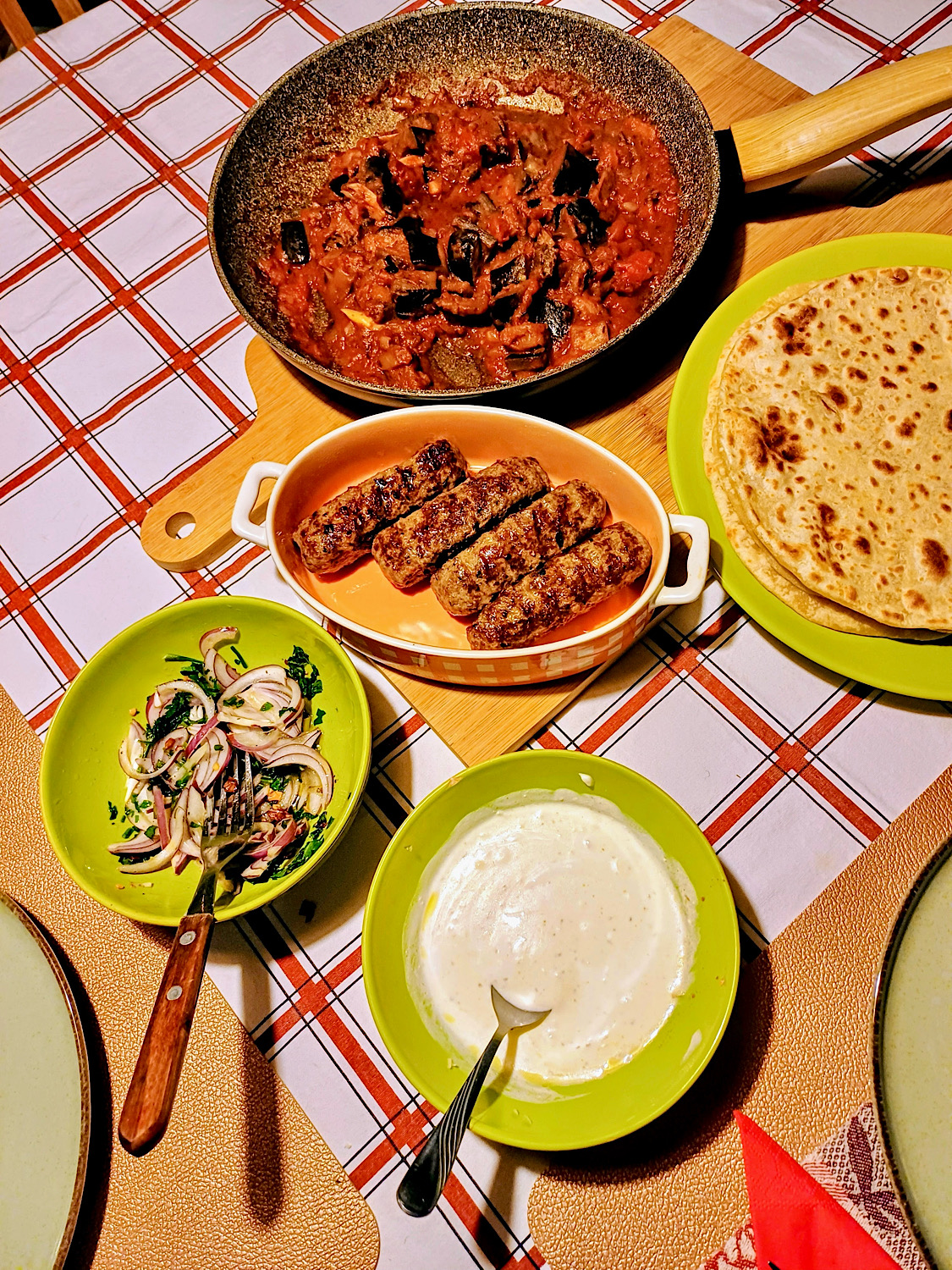 Vacsora, kisázsiai fúzió jeligére. Libanoni kofta, észak-török hagymasaláta, paradicsomos padlizsán Yotam Ottolenghi receptje alapján, római köményes-citromos-fokhagymás joghurtszósz meg egy kis házi lepénykenyér.