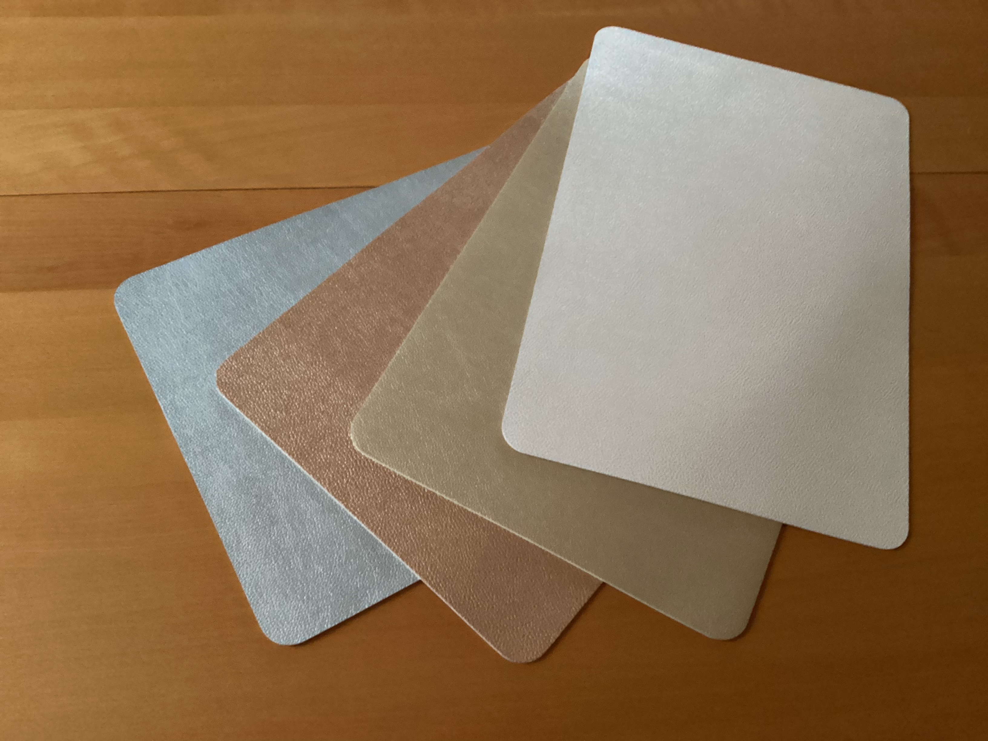 Ez itt négy darab műbőr tányéralátét. Már régóta kerestem olyan tányéralátétet, ami nem egészen üvöltően plasztik, de egy nedves ronggyal is letisztítható, a mi asztalunknál ugyanis malacok étkeznek vályúból, vagy legalábbis ez a benyomásom minden olyan alkalommal, amikor mosóba vágom az abroszainkat vagy a textil tányéralátéteinket. Mindehhez pluszban olyan tányéralátéteket akartam, amin nincs semmi csicsa, és megfelel ünnepi asztalhoz is, hétköznapihoz is. Ja, tudom, hogy sokat akarok egyszerre.