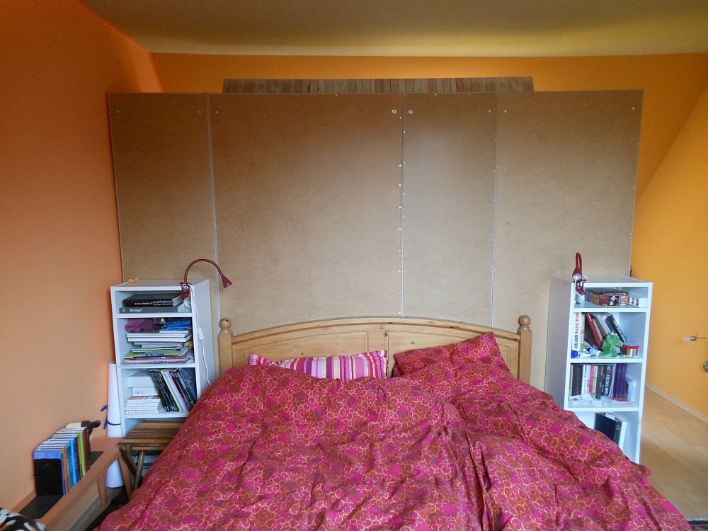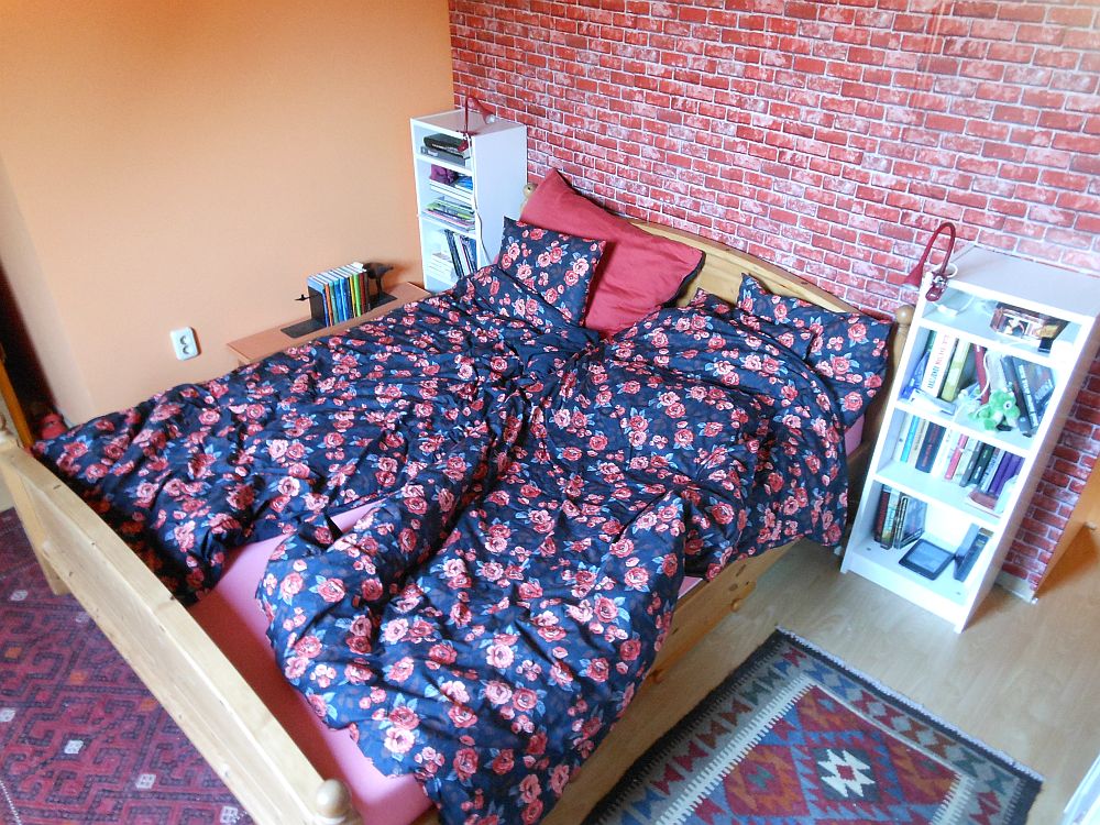 A fő bumbum azonban nem is az ágynemű, hanem a téglamintás öntapadós tapéta, amiből tizenkettő folyóméter ment bele a gardróbszekrény hátába, négy és fél órányi meló árán.