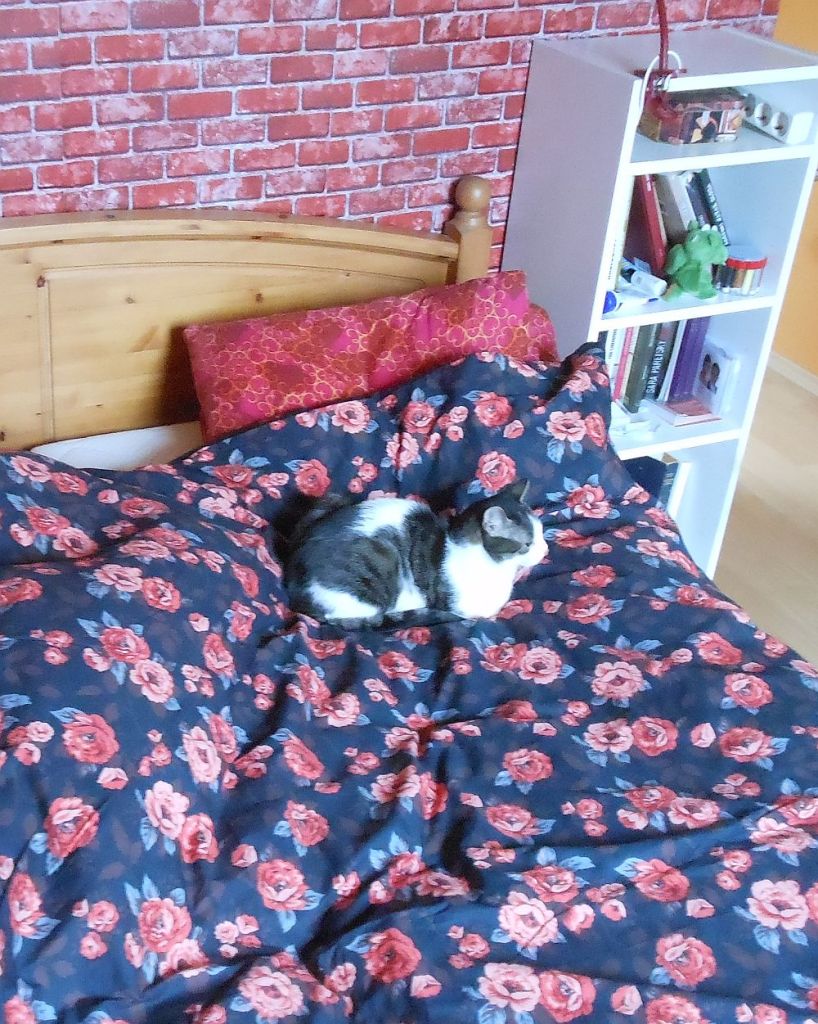 A rózsás ágynemű még tavaszi beszerzés volt, de eleve télre szántam, és kábé tíz éve ez az első ikeás huzatkészlet, amit nem turkálóból szedtem össze. Cserébe viszont olyan irgalmatlanul le volt értékelve, hogy az egyszemélyes paplanhuzatokat mind elkapkodták, és így muszáj volt az (éppolyan irgalmatlanul leértékelt) kétszemélyeseket megvennem. Na, ezen a hétvégén végre sikerült kétszemélyesből egyszemélyessé szabnom a drágaszágokat, és a fő revizor azonnal le is tesztelte: