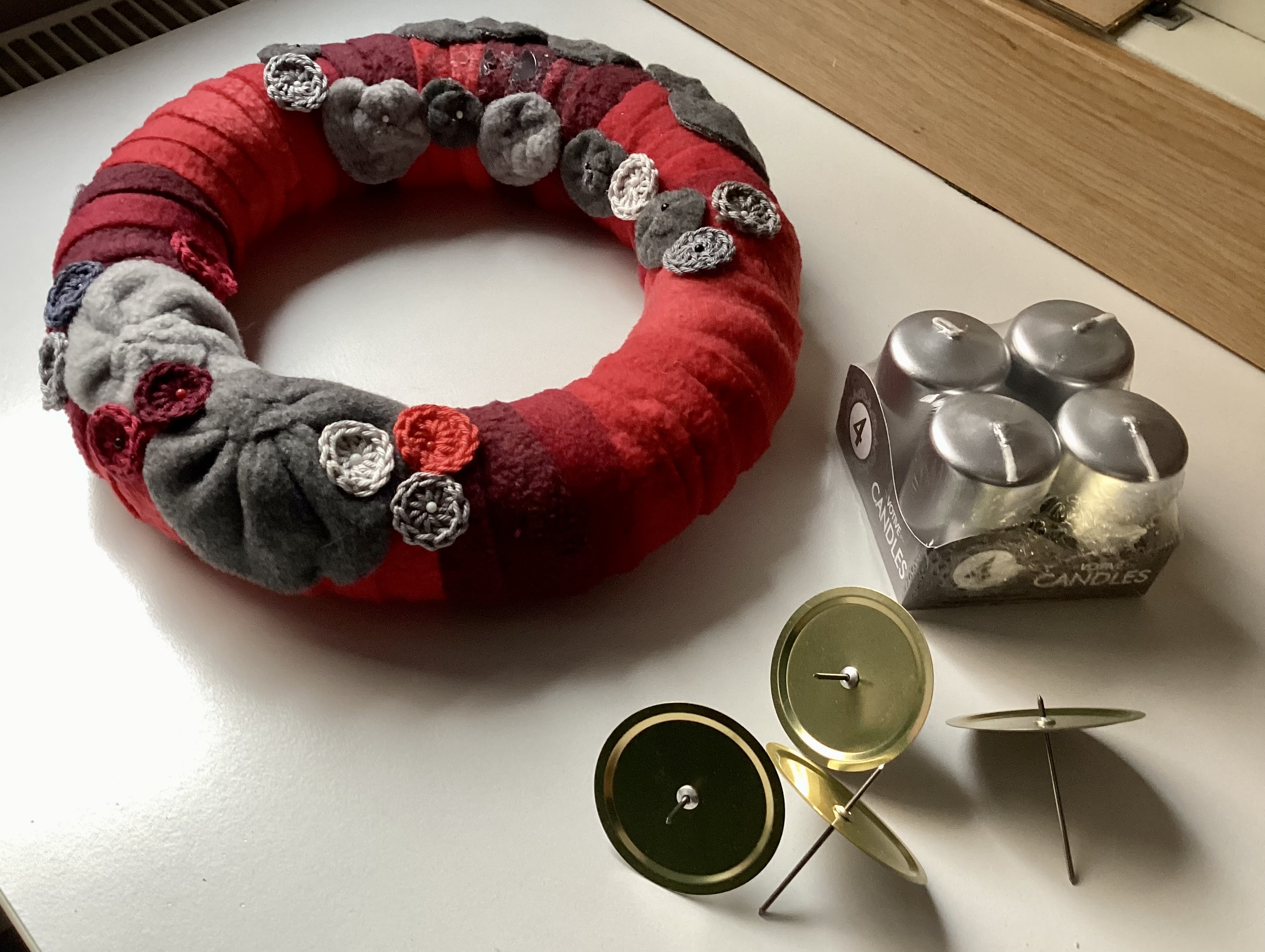Azt ugyan nem tudom, hogyan sikerült megoldani a rohangálás és nyivákolás közben, de az a különlegesen ritka helyzet állt elő, hogy már advent első vasárnapján van itthon a) kész koszorú, b) négy darab friss, még használatlan gyertyatartó prücike, c) négy új, bontatlan, egyforma gyertya. Ezekből csak a gyertyákat vettem frissen, amikor a héten az egyik buszravárós negyedórámban berongyoltam egy kínaibótba. A koszorú még a tavalyi, de a 2021-es gyertyatartó prücikéket a romos tavalyi gyertyákkal együtt kidobtam. Csodák csodájára viszont megtaláltam a tartalékokat a titokzatos mindentbele dobozaim egyikében. Én lenni elégedett.
