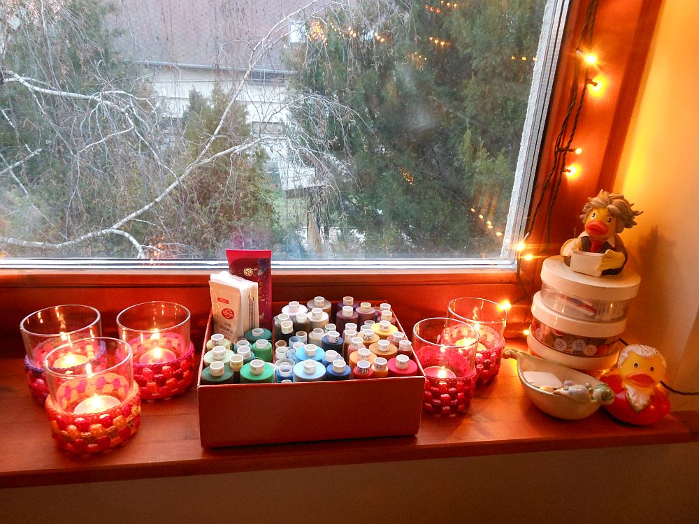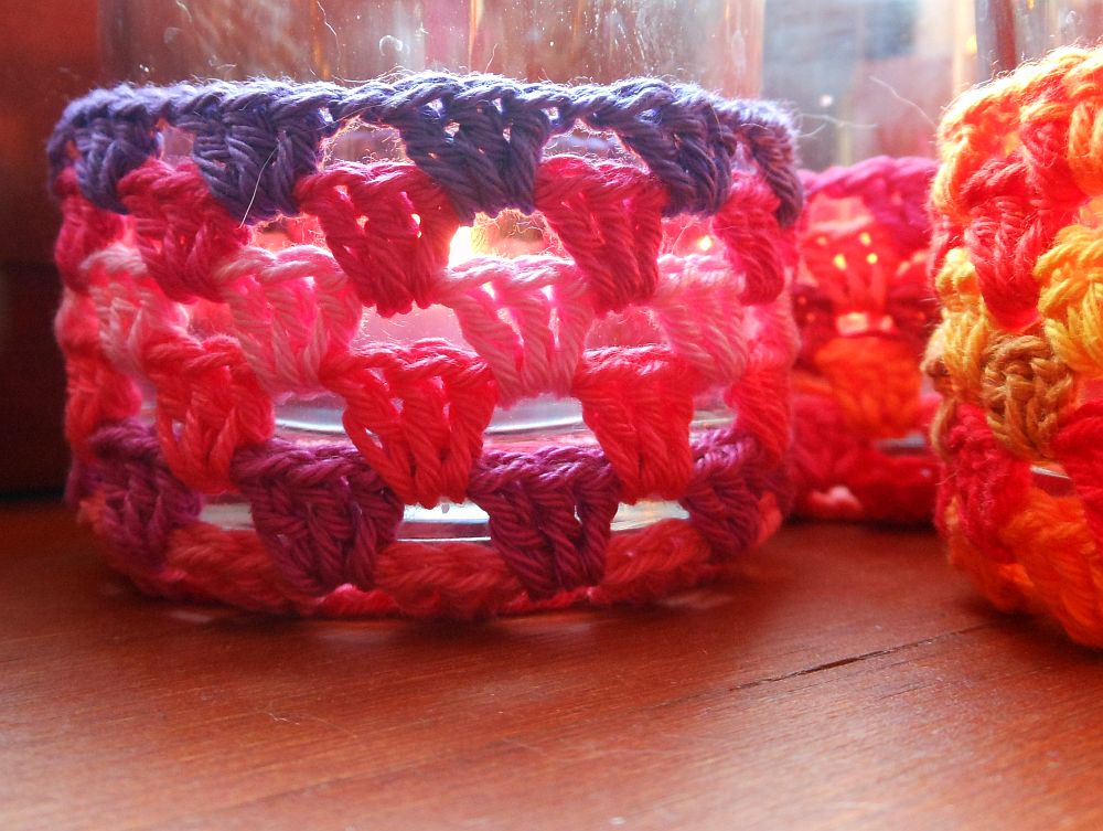 Hogy Greta mégis valamelyest kevésbé legyen morcos, meg mert lényegében mindent reciklálok valamilyen formában, amit csak lehetséges, a poharas illatgyertyák poharait is újra felhasználom: langyos sütőben felmelegítem őket, kitörlöm a maradék viaszt, alaposan kimosom a poharakat, aztán ezekbe rakom az illatmécseseket. (A Repülő Kutató meg viszkit iszik azokból, amikbe nem rakok illatmécsest, de ez csak mellékszál.) Idén találtam ki, hogy összekötöm a kellemest a haszontalannal, és kis burkokat készítek a poharaimra a már-csak-pár-méter-van-belőle-hát-ezzel-mit-kezdjek horgolófonalak felhasználásával. Nem gondoltam arra, hogy a kis huzatoknak kéne bármi név, de Vica a Dark Side Soutache-tól azt mondta rájuk, hogy “pohárpulcsik”, és ez sokkal jobb annál, mint hogy hagyjam veszendőbe menni.