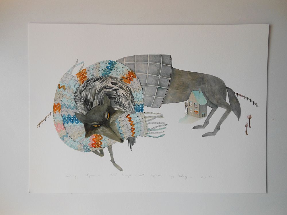 Ez a Parti Medve nevű hely nekem továbbra is erősen bűnbeviteli helyszínnek számít, minden rajz meg illusztráció meg grafika, amit náluk veszek, megmelengeti a szívem, még ez a kissé baljós farkas is. De hát nézzétek csak, milyen kabátja meg sálja van, meg kell zabálni.